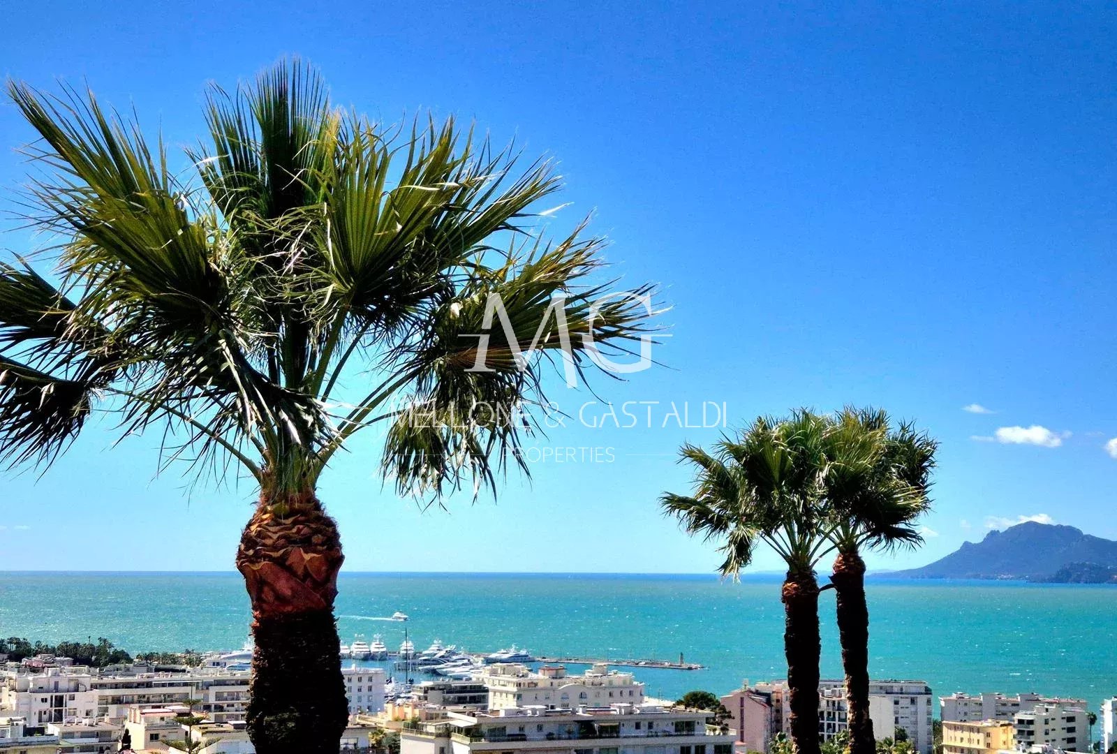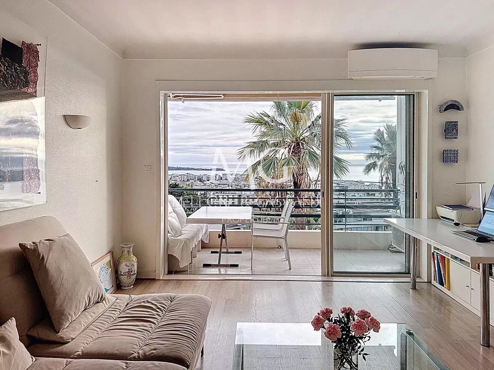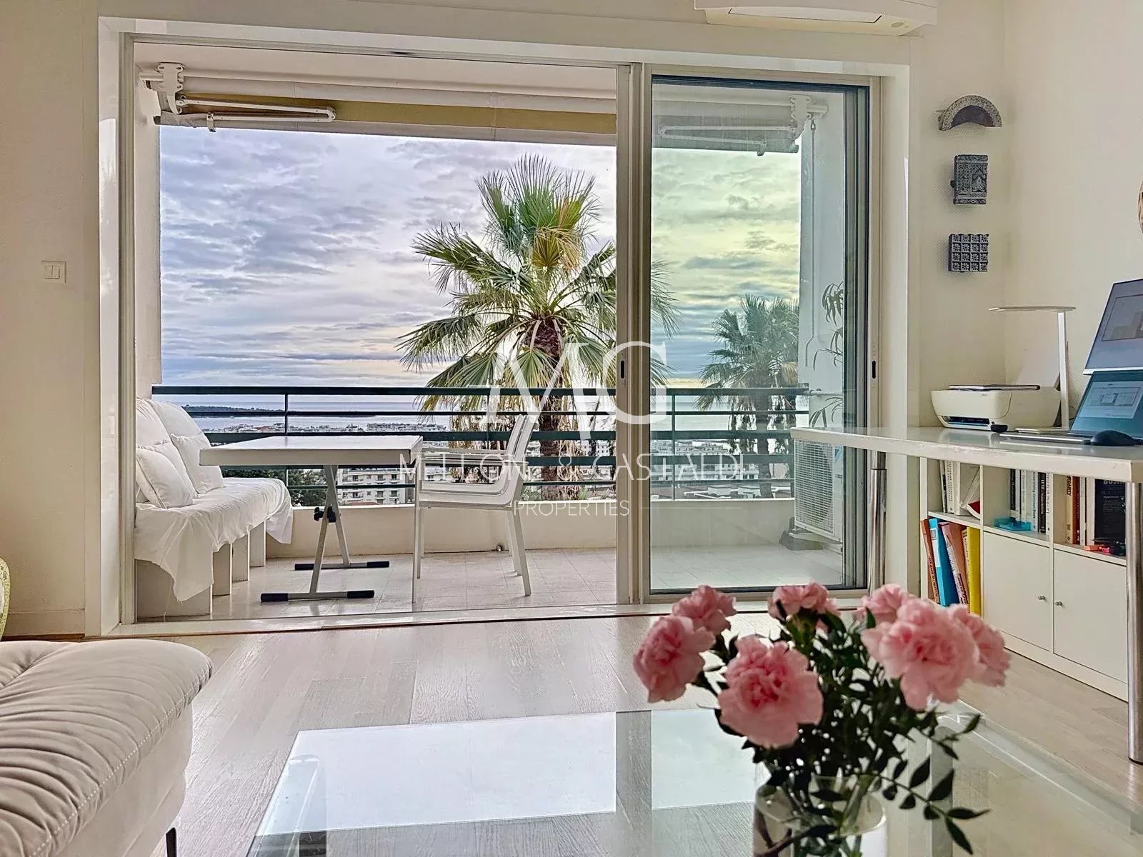 Baigné de lumière, l’appartement offre un séjour spacieux et lumineux ouvrant sur une terrasse plein sud de 7 m², offrant une vue panoramique exceptionnelle sur la baie de Cannes et les îles de Lérins
