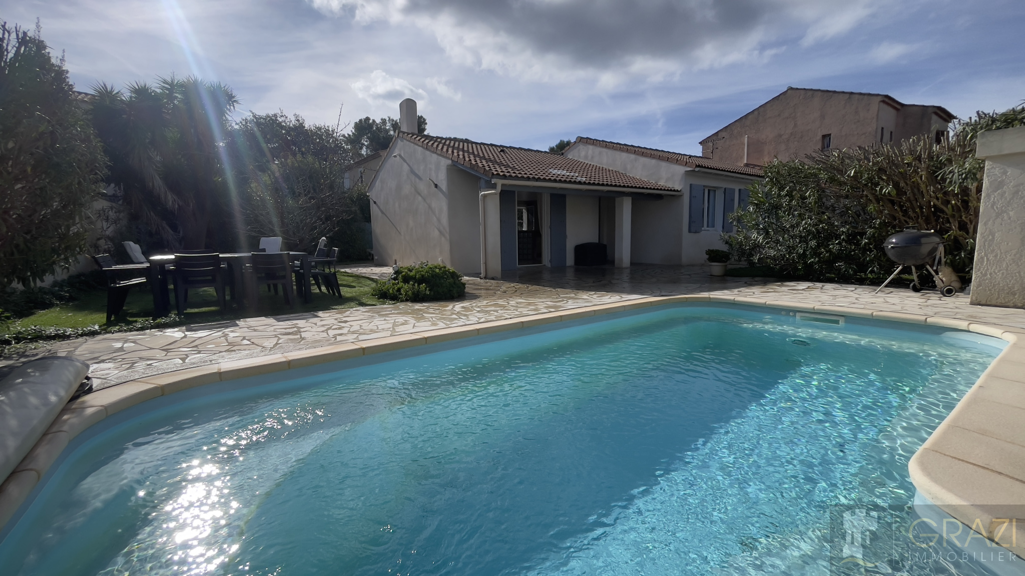 Découvrez cette sublime villa de plain-pied, nichée au fond d'une impasse verdoyante à Janas, où calme et sérénité règne. Idéalement située, cette résidence de type 5 allie charme et fonctionnalité pour un art de vivre unique. Un intérieur lumineux et spacieux : - 3 chambres généreuses, dont une transformable en suite parentale pour un confort optimal. - Un grand séjour baigné de lumière, ouvert sur une cuisine américaine entièrement équipée (parfaite pour les amateurs de cuisine et de convivialité). - Un dressing indépendant pour un rangement optimisé. - Une salle d'eau rénovée avec soin, alliant modernité et praticité. Un extérieur pensé pour le bien-être : - Un terrain de 515 m2, véritable écrin de verdure avec arbres fruitiers et espaces ombragés. - Une piscine pour des moments de détente en famille ou entre amis, avec son local technique intégré. - Une terrasse couverte, idéale pour les repas en plein air ou les soirées estivales. Un garage attenant avec buanderie complète cet ensemble, offrant un espace de rangement supplémentaire et une entrée pratique. Un bien rare, à saisir sans attendre : Cette villa allie intimité, confort et élégance, dans un cadre préservé et recherché. Parfaite pour une famille ou pour ceux qui rêvent d'un lieu de vie paisible et fonctionnel.