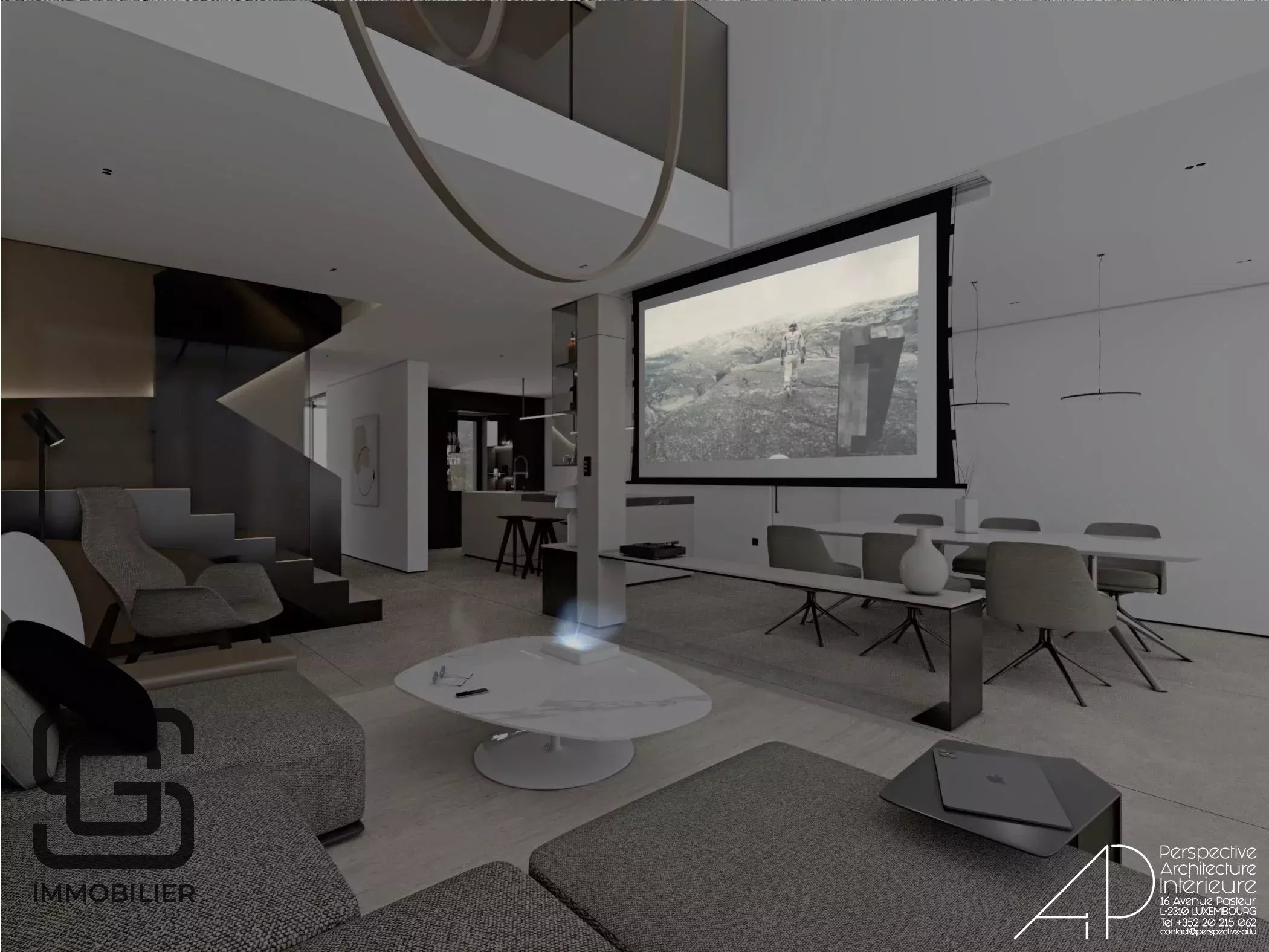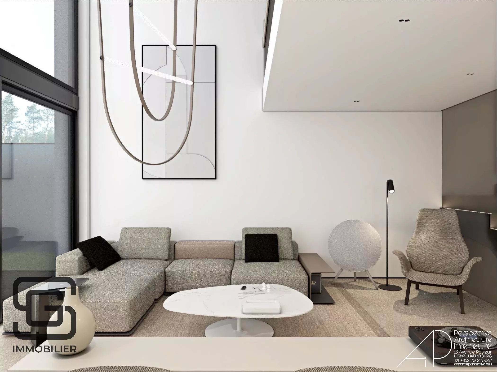 - d'un magnifique séjour de 51m2 agrémenté d’une baie vitrée sur mesure atteignant une hauteur impressionnante de plus de 7 m, offrant une ouverture panoramique sur le jardin avec une impression de "dedans-dehors"