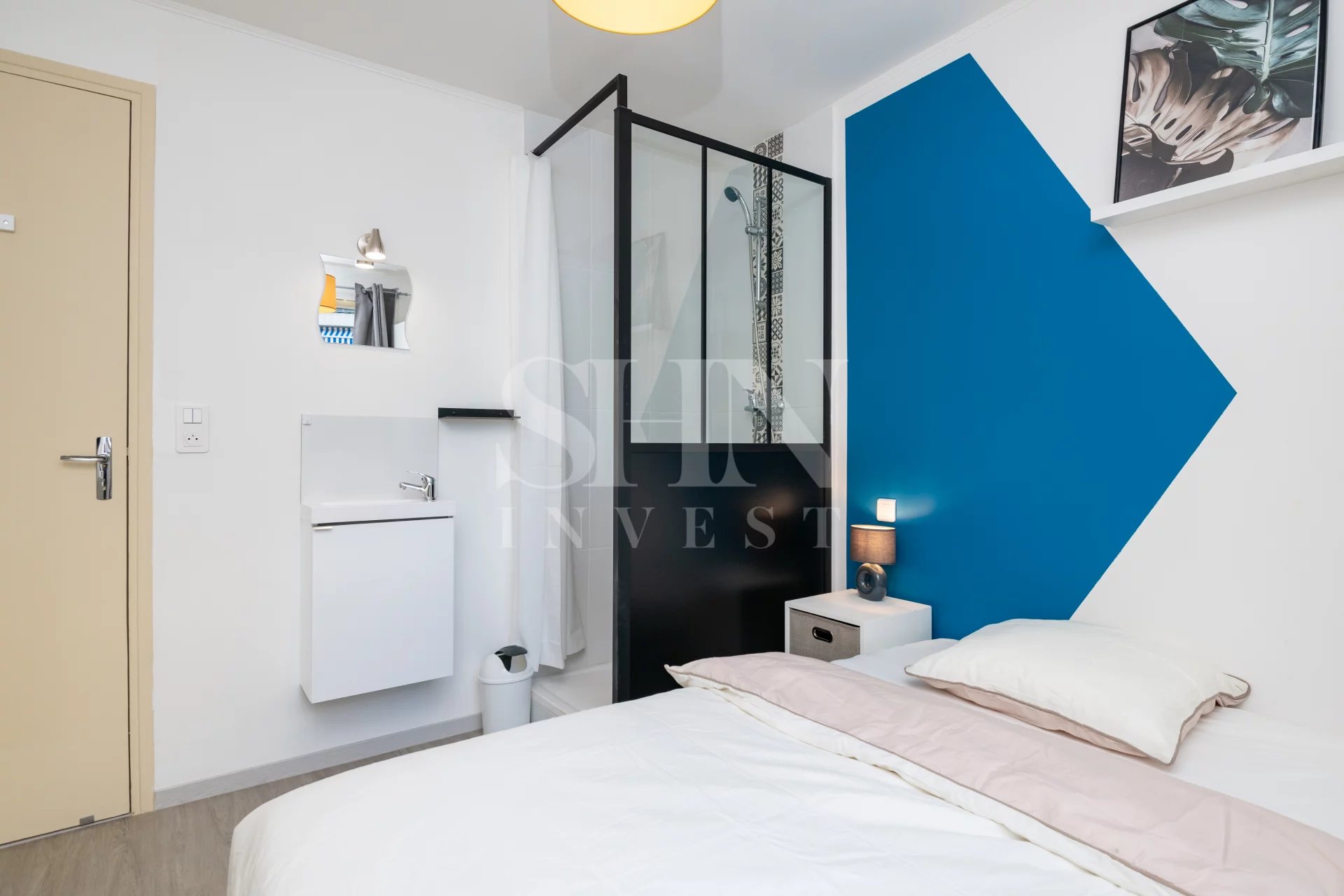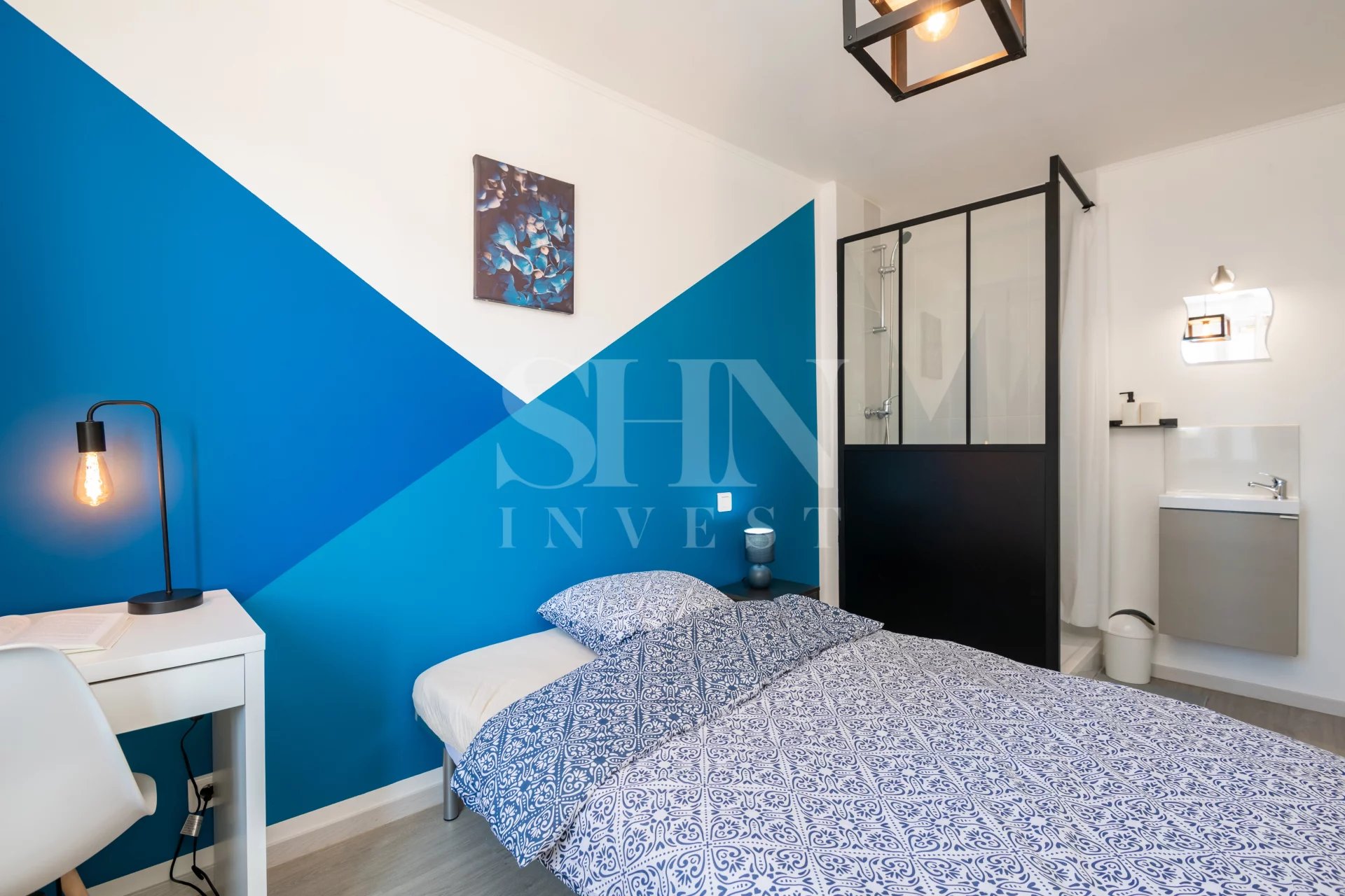 Entièrement équipée (lit, bureau, armoire, douche)