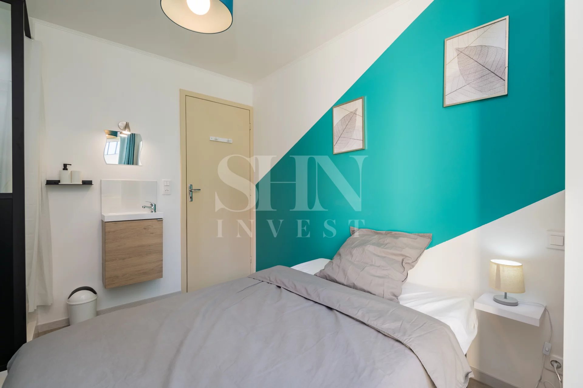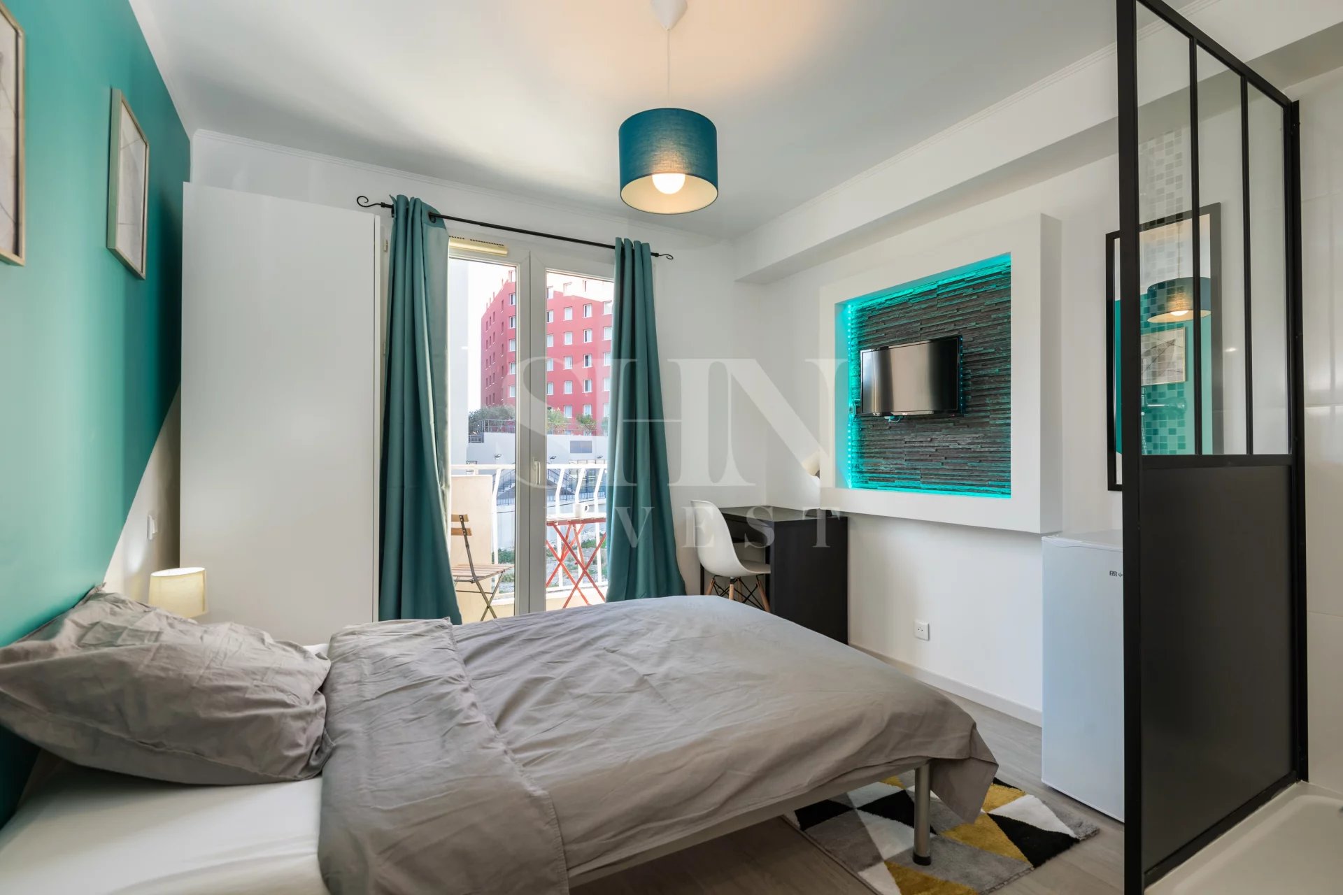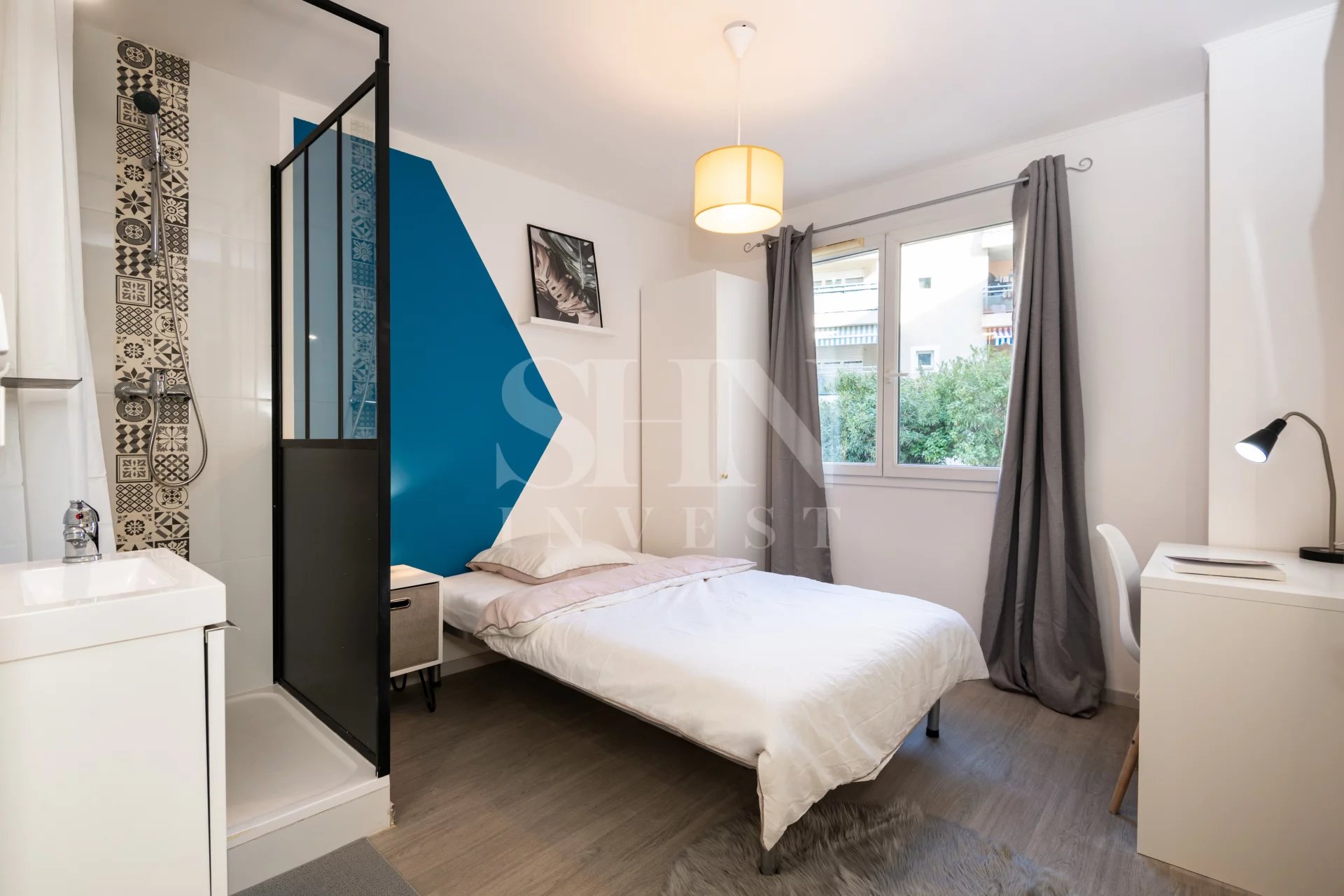 Entièrement équipée (lit, bureau, armoire, douche, balcon)