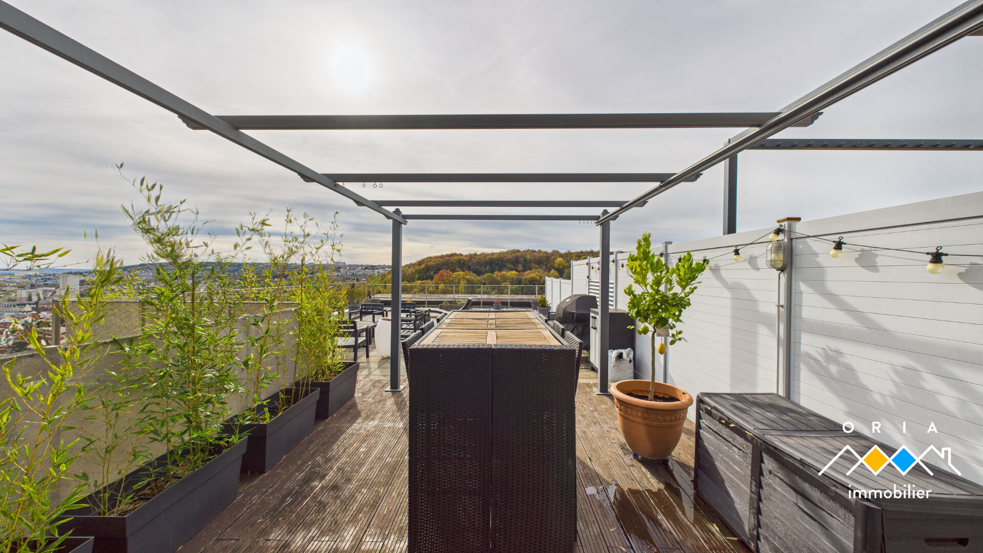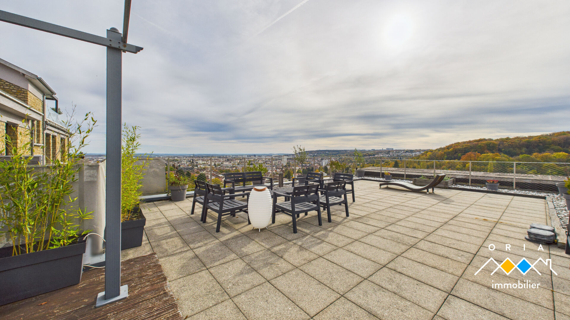 ORIA IMMOBILIER PULNOY vous présente : Magnifique appartement en duplex, dans un style industriel loft, situé sur les hauteurs de LAXOU rue du Plateau. Ce bien de 94 m², entièrement rénové avec goût, séduit par ses volumes, sa luminosité et son atmosphère unique. L'entrée dispose d'un placard intégré, puis s'ouvre sur une superbe pièce de vie de plus de 40 m² comprenant un salon-séjour et une cuisine ouverte moderne et conviviale. Au rez-de-chaussée, vous trouverez également une salle d'eau avec WC ainsi que 2 chambres dont une avec un espace rangement en mezzanine de 9,45 m², pouvant faire office de coin nuit supplémentaire, de bureau ou d'espace jeux pour un enfant. Depuis la pièce à vivre, vous accédez à une vaste terrasse de plus de 93 m², offrant une exposition idéale et une vue panoramique imprenable sur tout le Grand Nancy. Cet espace extérieur rare constitue un véritable lieu de vie à part entière. A l'étage, la passerelle mène à un espace de rangement supplémentaire d'environ 8 m² ainsi qu'à une belle mezzanine d'un peu moins de 20 m² surplombant le séjour, parfaite pour un coin bureau ou un espace détente. L'appartement se situe dans une résidence calme et bien entretenue offrant ainsi un cadre de vie paisible. Un bien de standing, rare sur le secteur, qui séduira les amateurs de beaux volumes et de charme contemporain. Un véritable coup de coeur à découvrir sans tarder. Copropriété aux faibles charges (63 euros/mois). Les informations sur les risques auxquels ce bien est exposé sont disponibles sur le site Géorisques : www.georisques.gouv.fr Copropriété de 18 lots - dont 15 lots habitation. (Pas de procédure en cours). Charges annuelles : 752 euros. Théo MAHEVAS (EI) Agent Commercial - Numéro RSAC : 981 528 151 - NANCY.