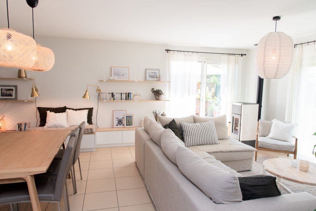 Grande pièce de vie lumineuse avec cuisine ouverte donnant sur terrasse et jardin