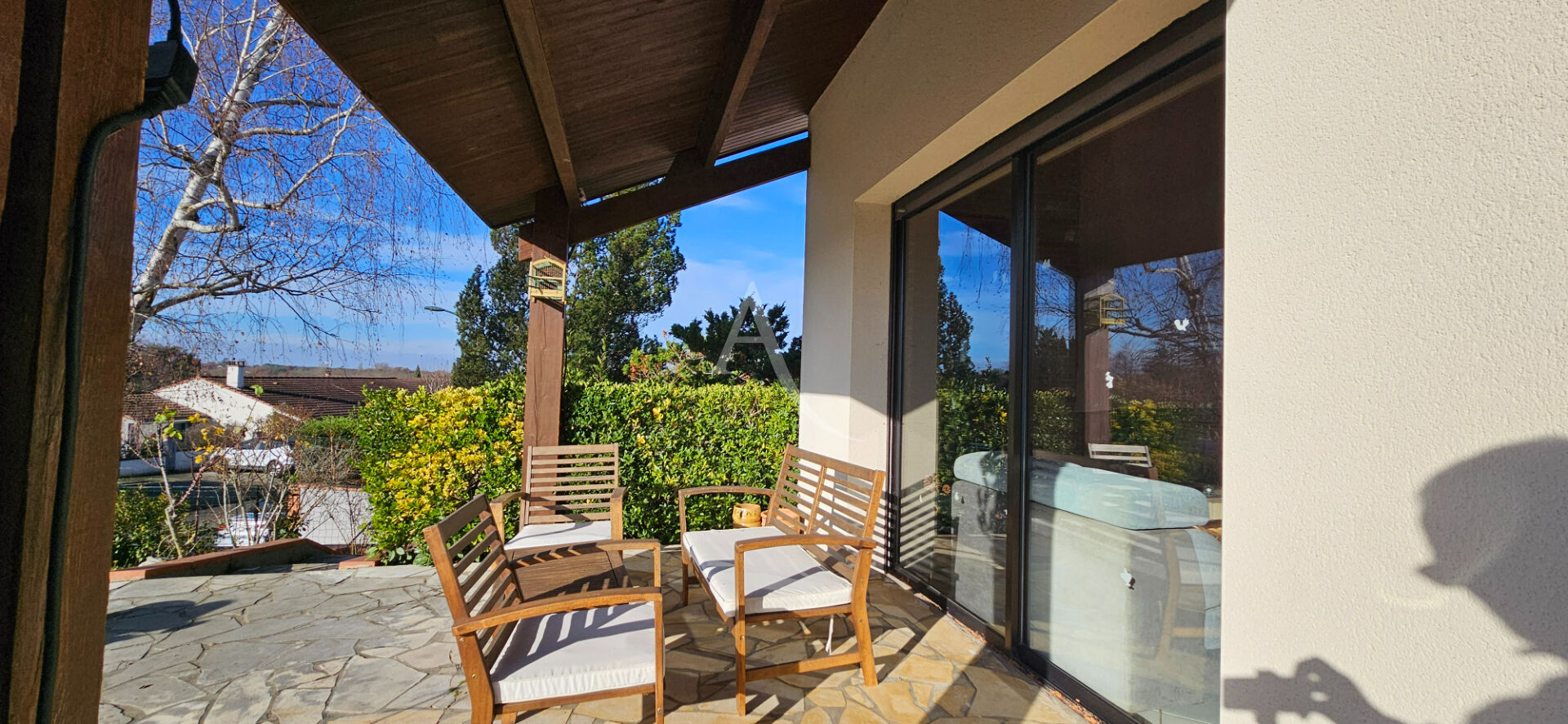 Située dans un quartier résidentiel, villa T5 de 144m² très lumineuse, comprenant un vaste séjour de 47m² avec cheminée, une cuisine de 13m² avec cellier, 3 chambres, une salle de bains avec WC et une salle d'eau avec WC. A l'étage, une mezzanine à usage de bureau et une 4e chambre avec pièce attenante. Un accès aux combles de 20m² vous offrira un bel espace de stockage ou autres. Climatisation au rdc et panneaux solaires. Côté extérieur, un beau jardin arboré et clôturé sur une parcelle de 805m² , une piscine avec 2 terrasses, un barbecue, un cabanon, un double garage, une cave et un local technique. Le tout sans vis à vis, au calme et proche des commerces.