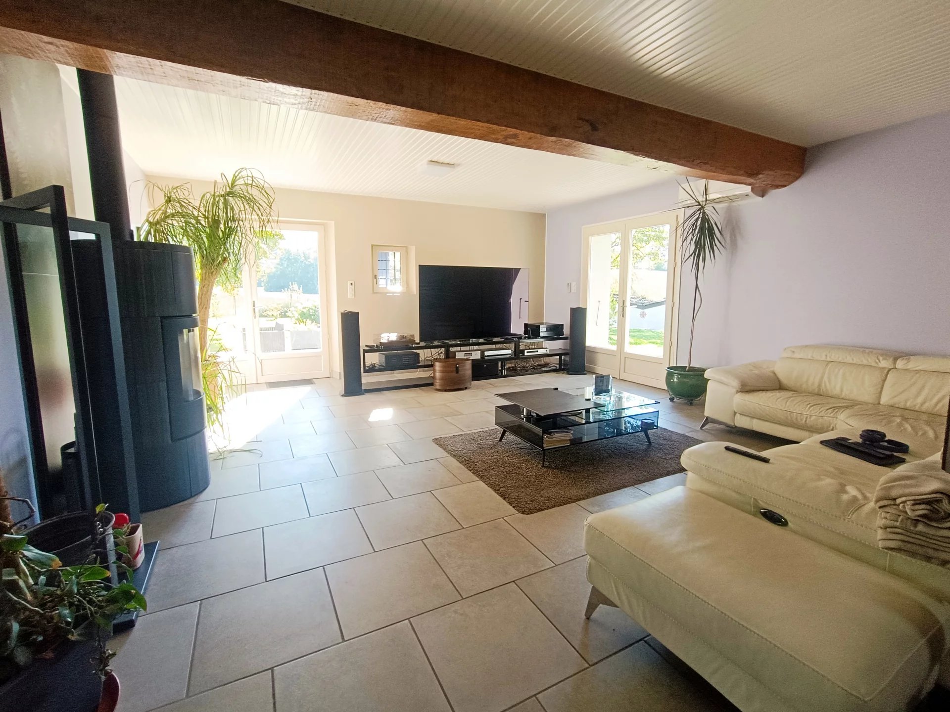 - Un vaste salon avec poêle a bois et baie vitrée sur l'exterieur