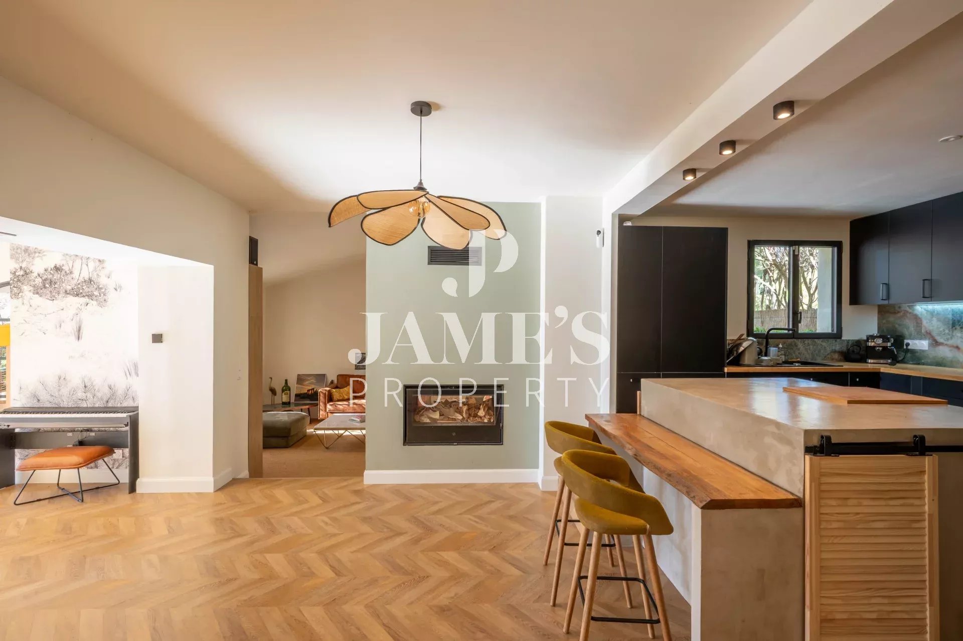 Au rez-de-chaussée, une vaste pièce de vie lumineuse accueille une cuisine ouverte sur la salle à manger, ainsi qu'un salon indépendant doté d'une cheminée à double foyer et d'une belle hauteur sous plafond.