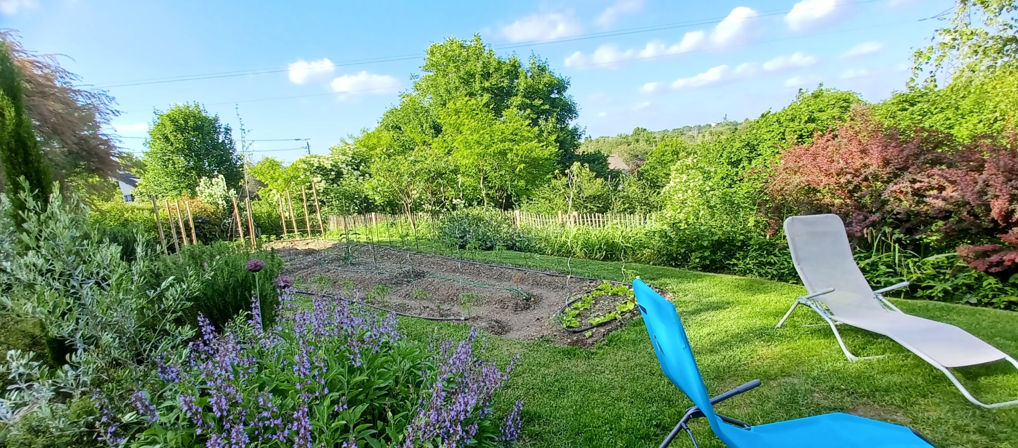 Très agréable jardin paysagé sur env.1400 m2 avec divers espaces, arborés, ombragés et fleuris, potager, entièrement clos et sans vis à vis. Secteur résidentiel calme et prisé sur les hauteurs, à 5 minutes de Moulins.