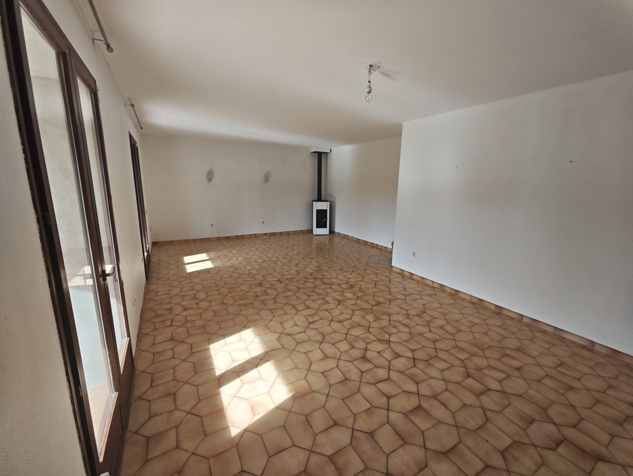 Séjour lumineux, accompagné d'un poêle à bois, cuisine séparée équipée fonctionnelle,