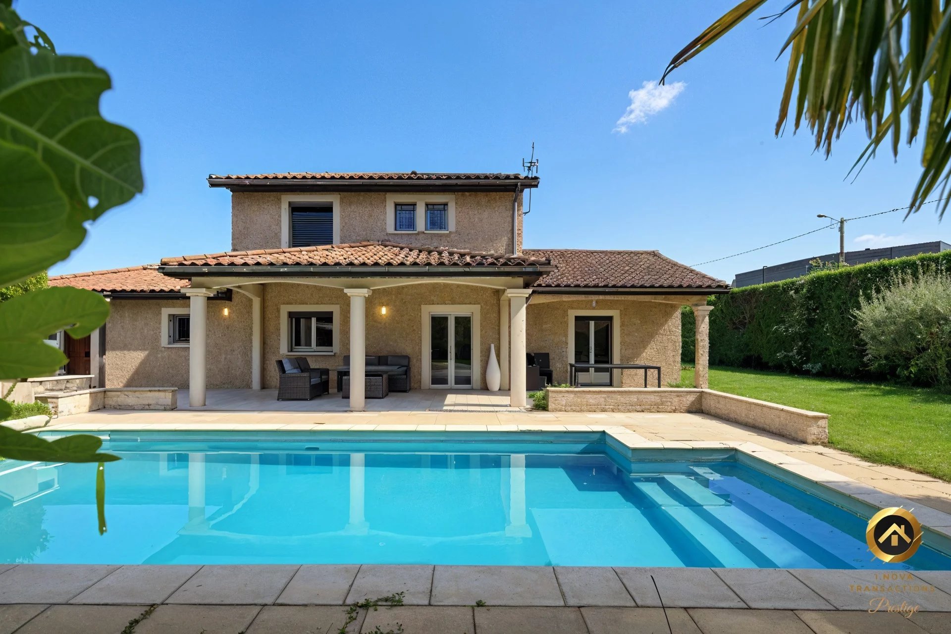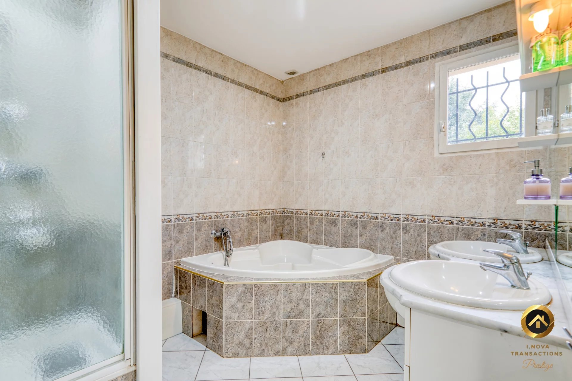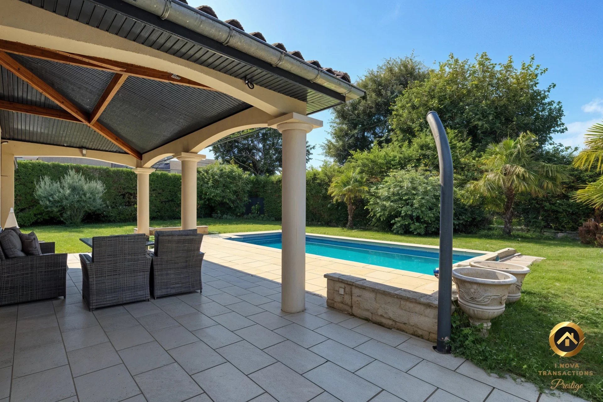 A l'extérieur, vous retrouvez une grande piscine, une immense terrasse carrelée avec une partie couverte, le tout sur une parcelle de 837 m2.