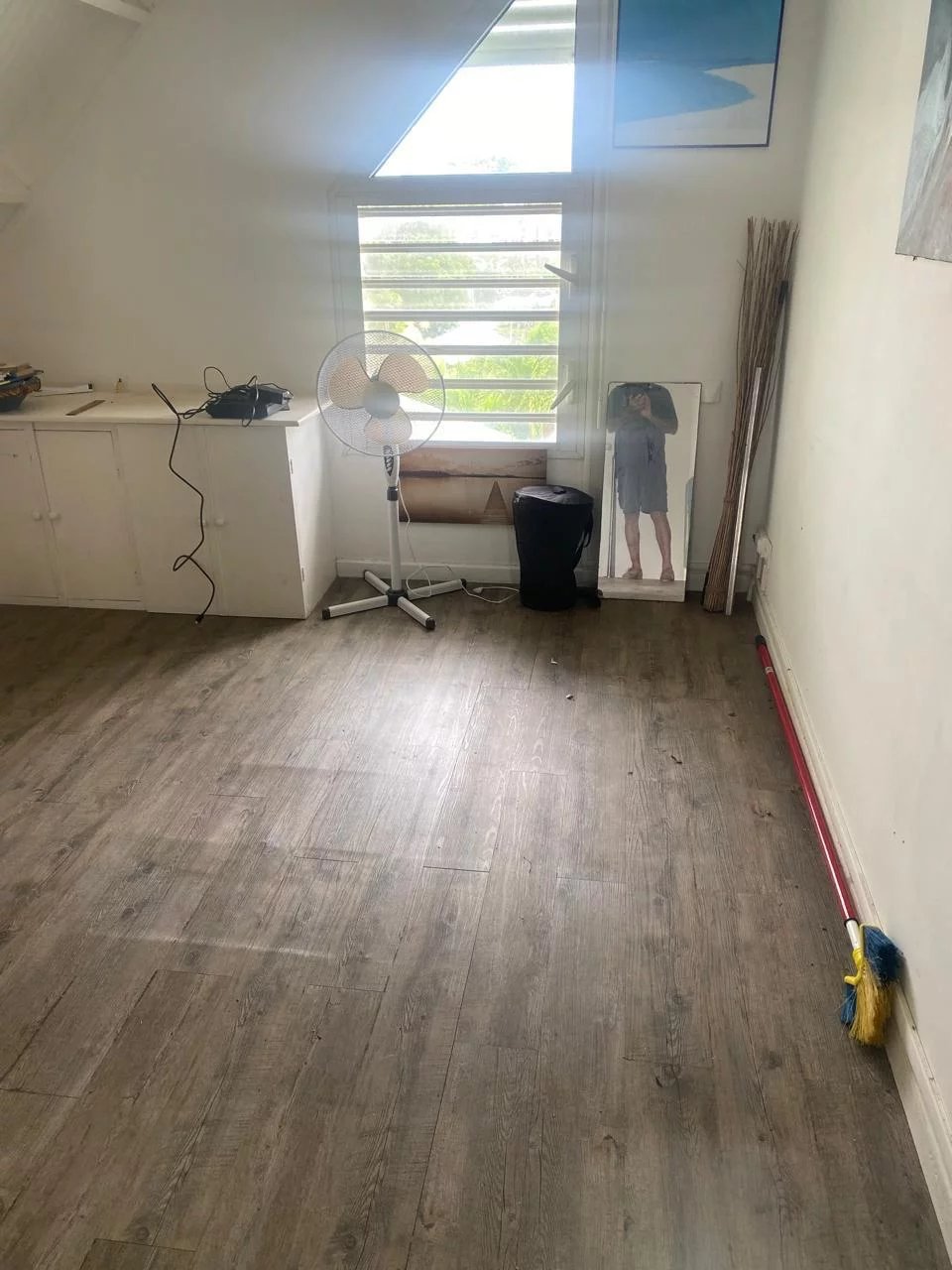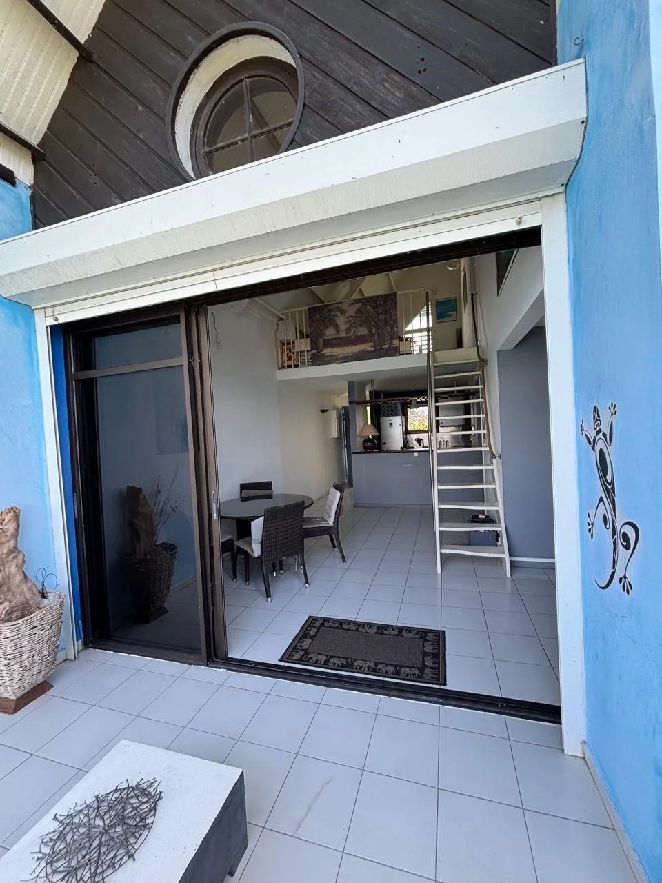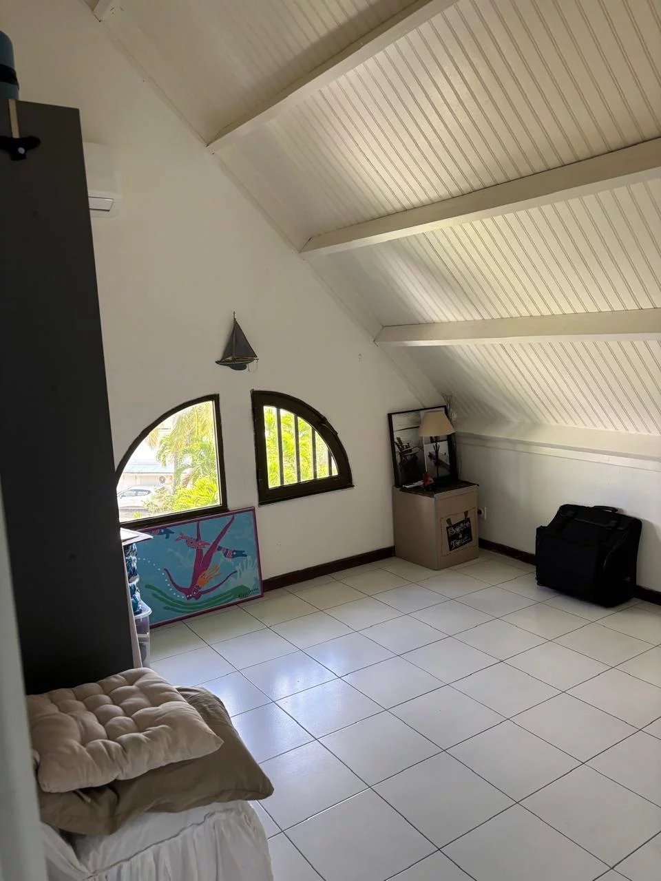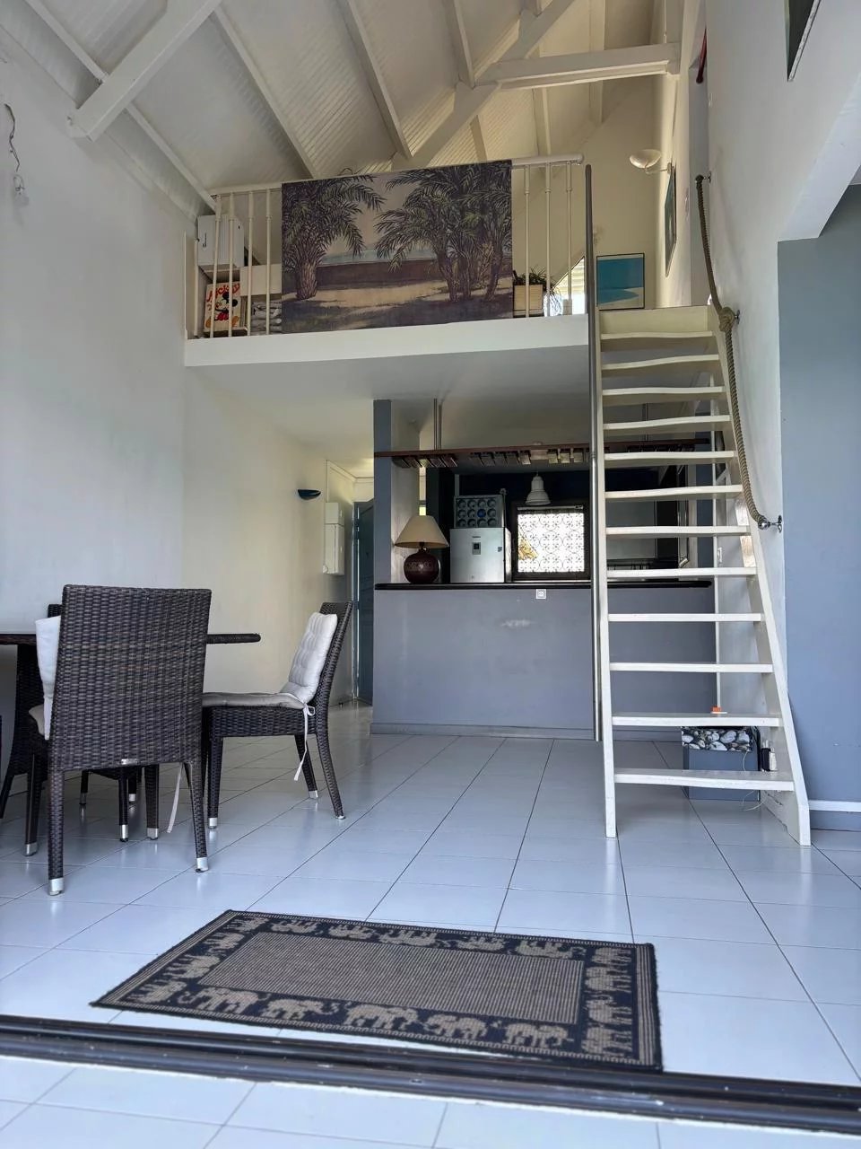 A l'étage : 1 grande mezzanine, 2 chambres climatisées, 1 salle d'eau avec wc. 1 place de parking privée
