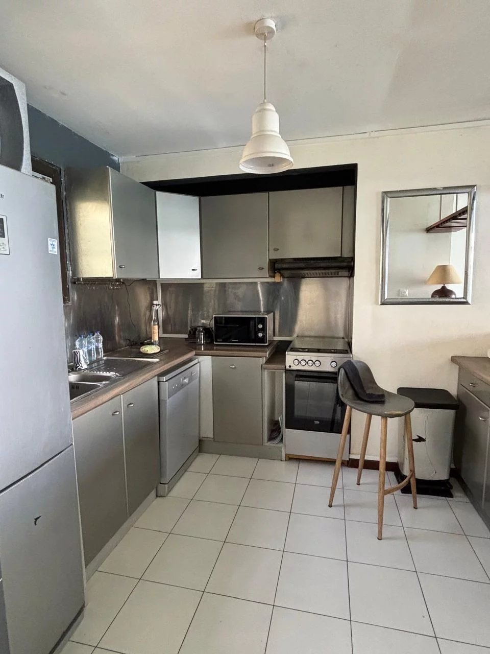 Au rdc : 1 dégagement, 1 salle d'eau, 1 wc indépendant, 1 cuisine américaine, aménagée et équipée, 1 séjour en L donnant sur 1 terrasse, 1 chambre climatisée avec placard.