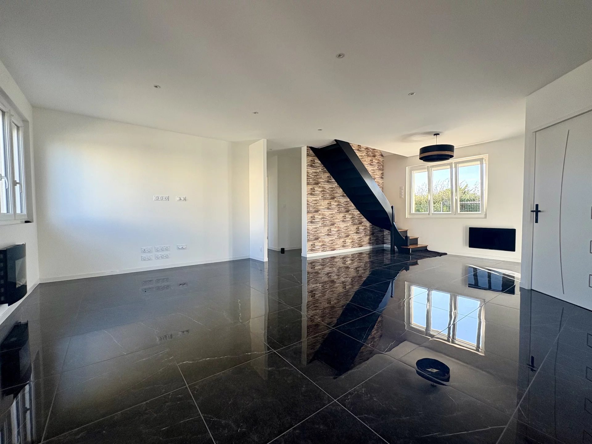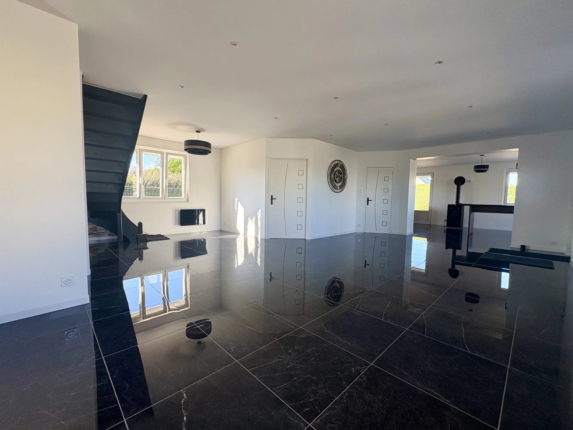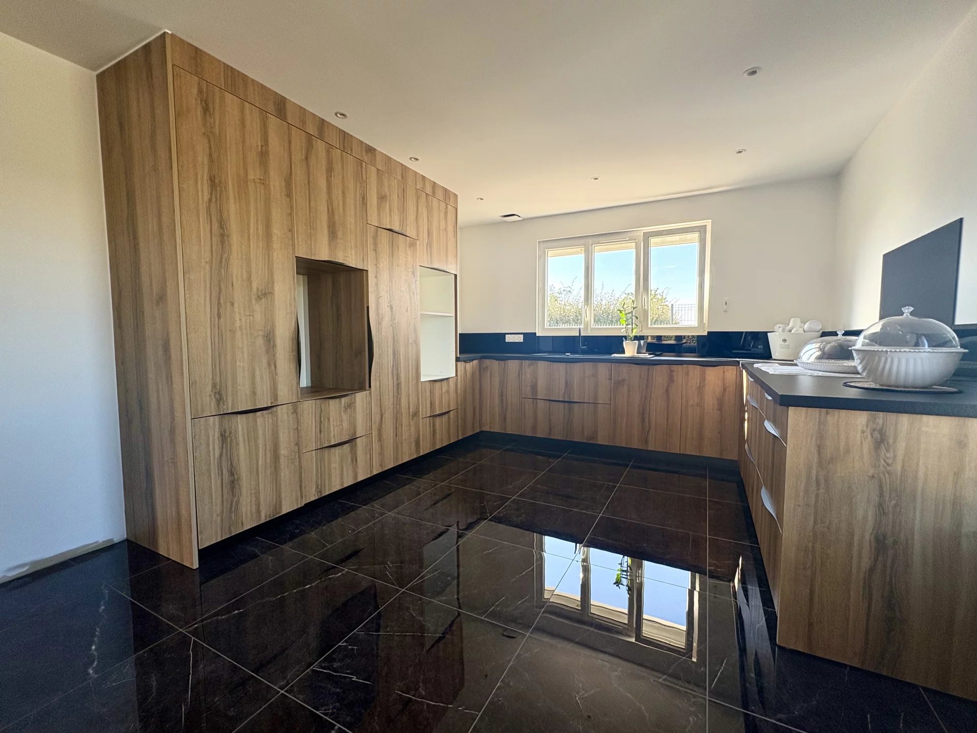 > Au rez-de-chaussée, l’entrée s’ouvre sur une pièce de vie chaleureuse de 55 m², idéal pour recevoir. Sa cuisine moderne, entièrement aménagée et équipée, et donnant accès sur une terrasse de +40 m² allie élégance et fonctionnalité.