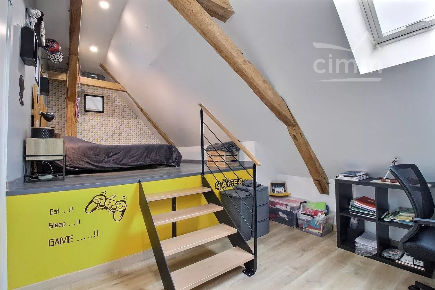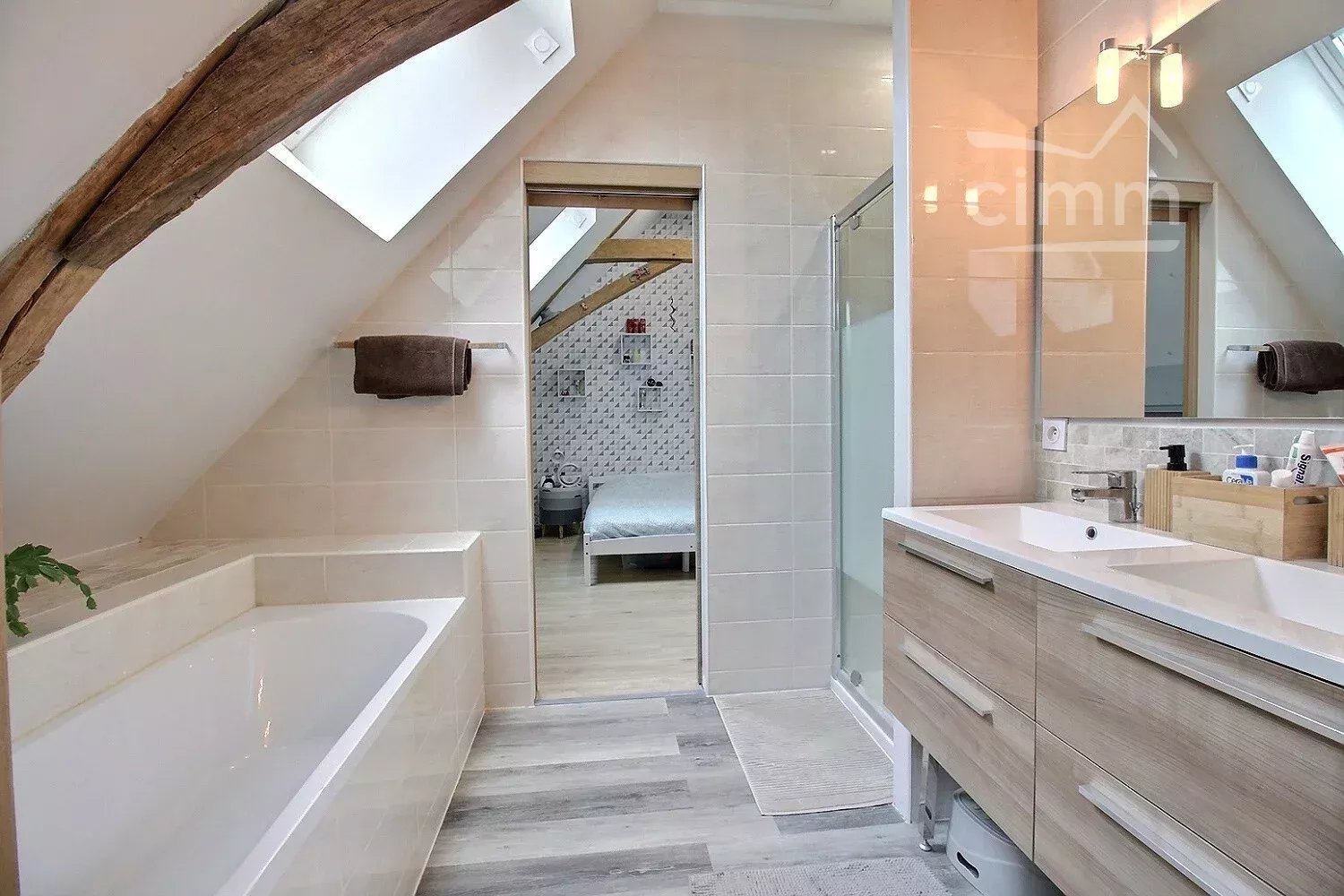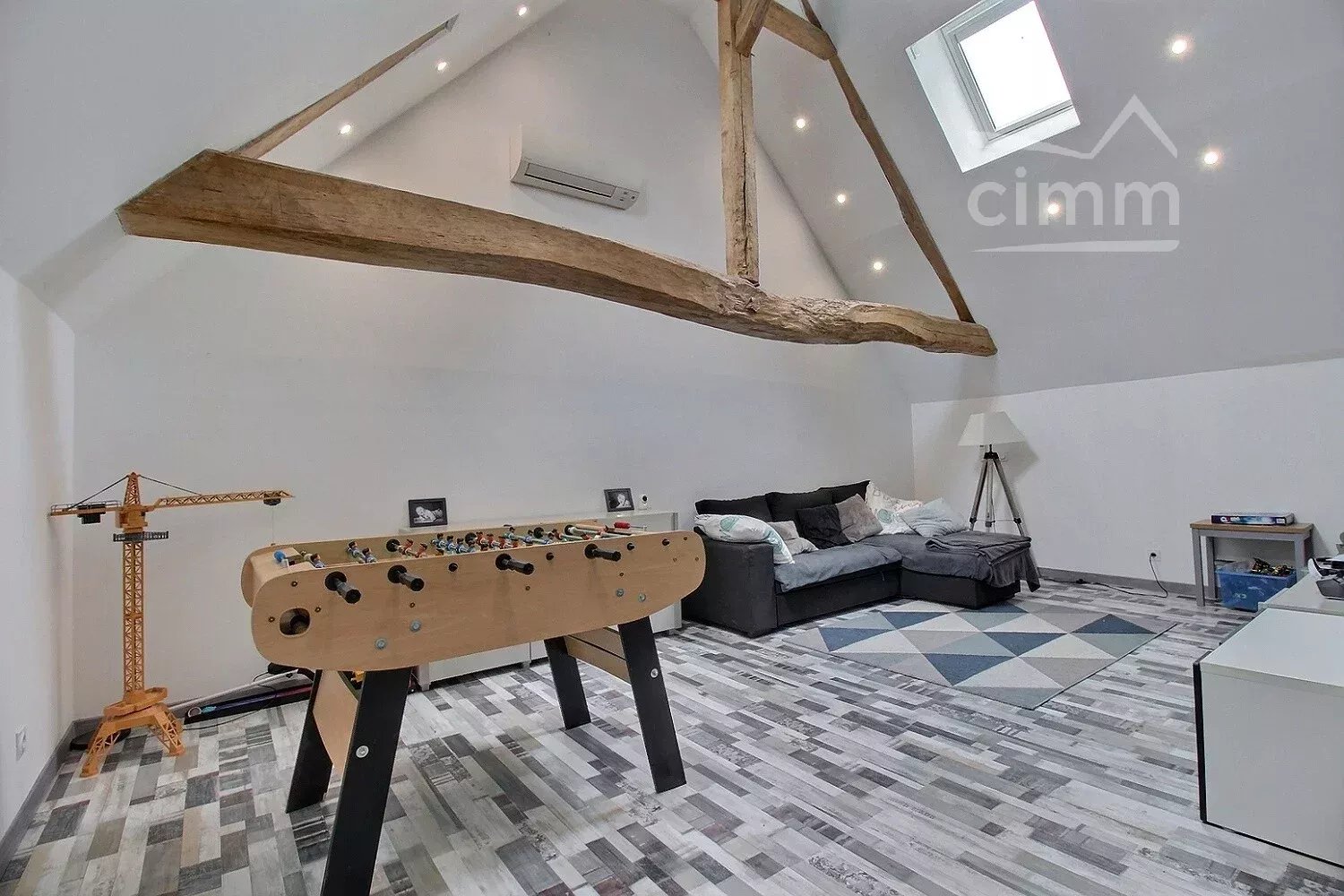 L'étage s'ouvre sur une grande mezzanine lumineuse faisant aujourd'hui office de salle de jeux ou d'espace détente, donnant sur une première chambre ou bureau, quelques marches plus hautes vous trouverez 2 autres chambres, reliées par une salle de bains avec douche et baignoire, ainsi qu'un WC indépendant.