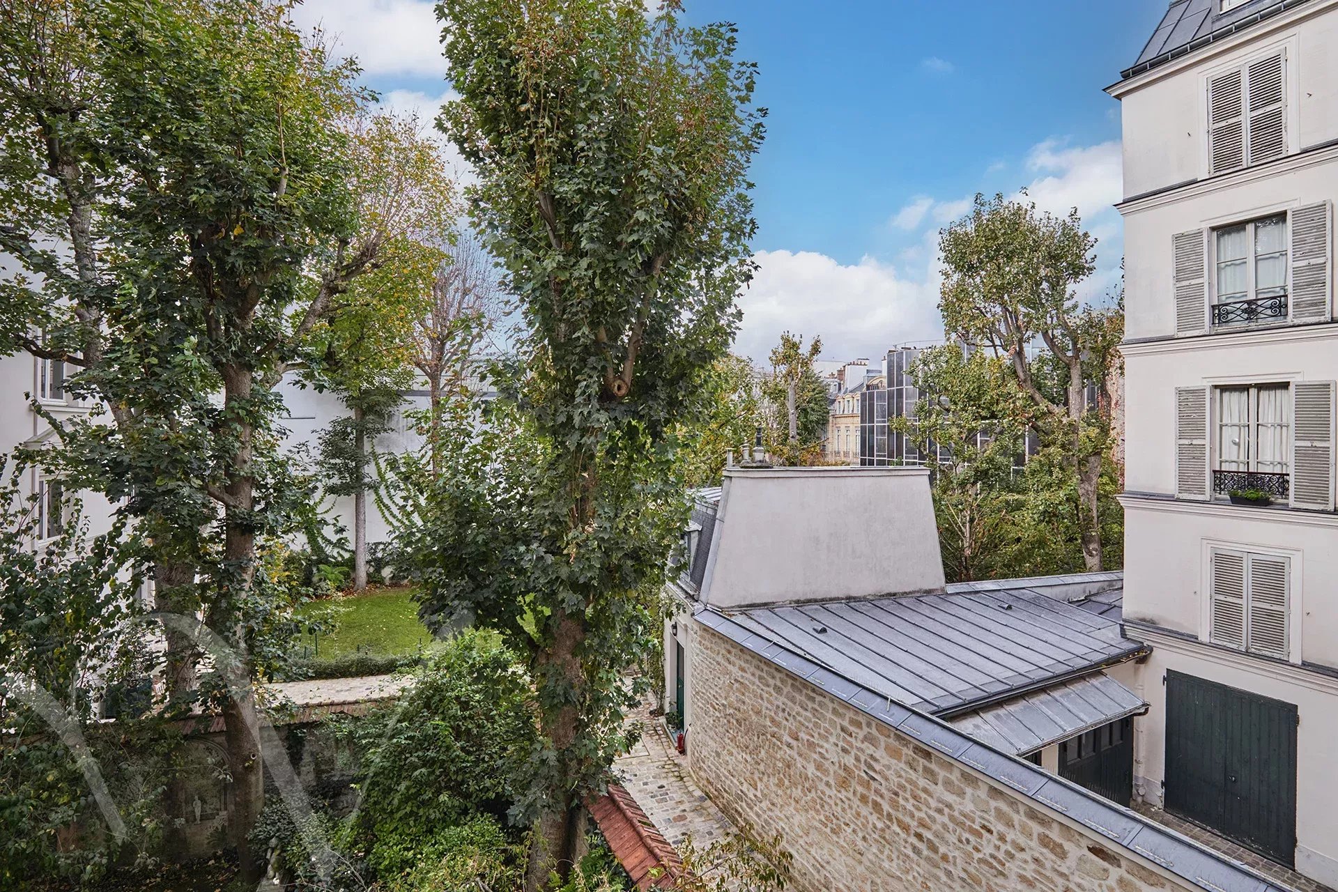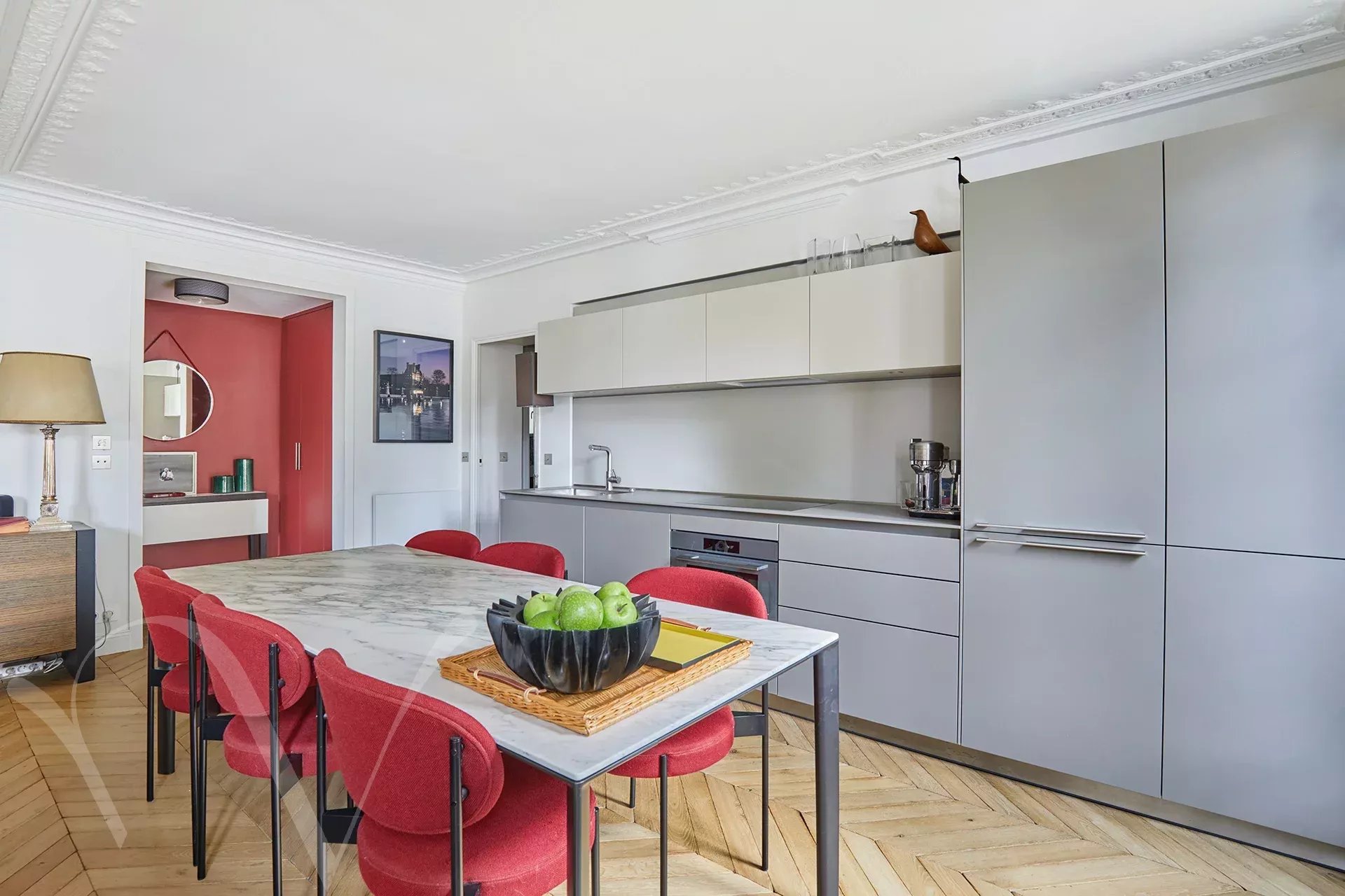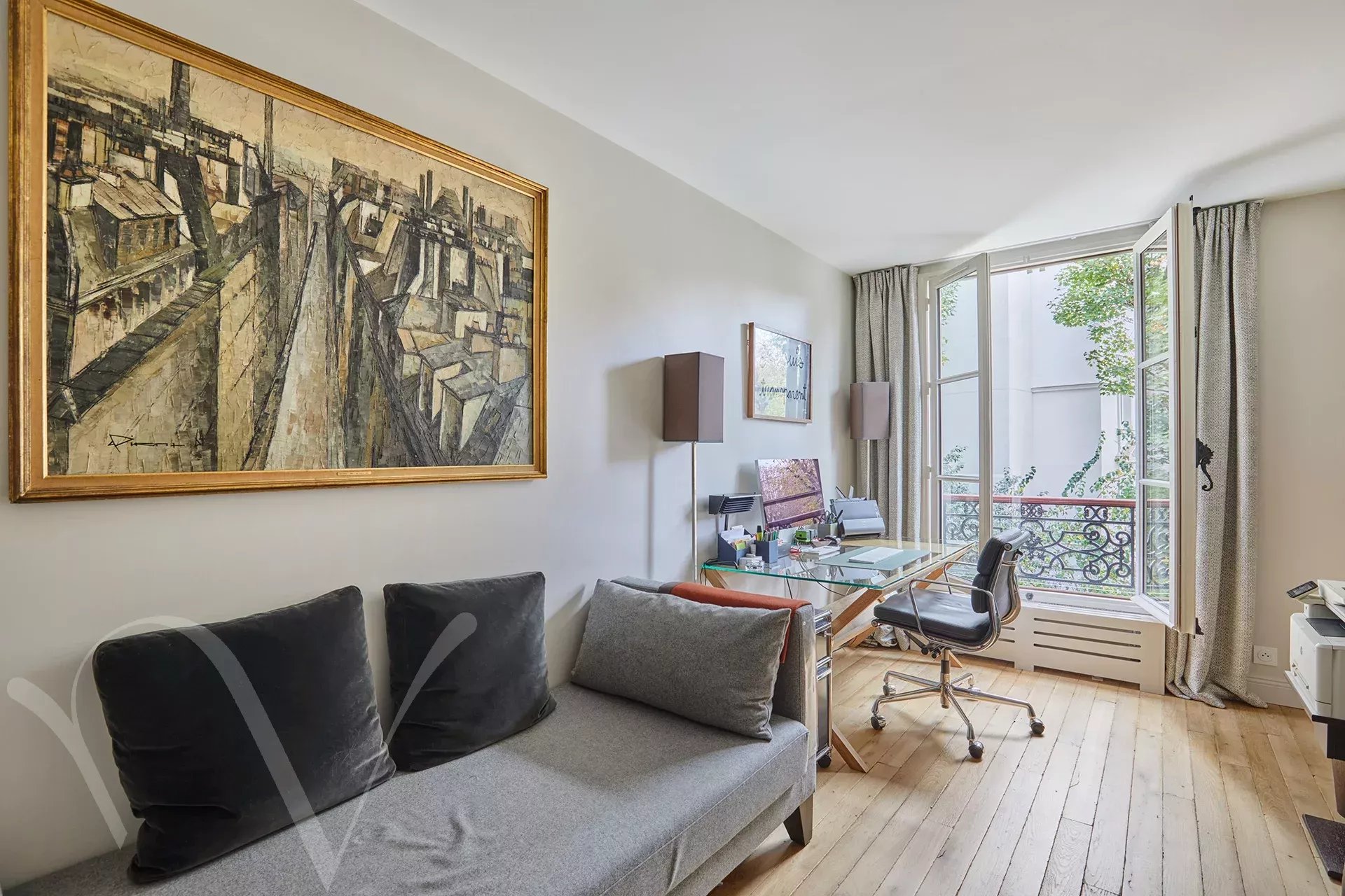 Au cœur de Saint-Germain-des-Prés, dans la jolie rue du Pré-aux-Clercs, au deuxième étage avec ascenseur d'un bel immeuble construit en 1900, un appartement de 89 m² loi Carrez composé d'une entrée avec un vestiaire, une belle pièce de réception de 38 m² avec salon, salle à manger et cuisine de la marque Bulthaup, une chambre avec sa salle de douche avec toilettes et coin buanderie, une deuxième chambre avec grand dressing et sa salle de bains, toilettes séparées. L'appartement a été rénové avec des matériaux haut de gamme. Il donne entièrement sur des jardins, à l'ouest, et bénéficie du calme absolu.
