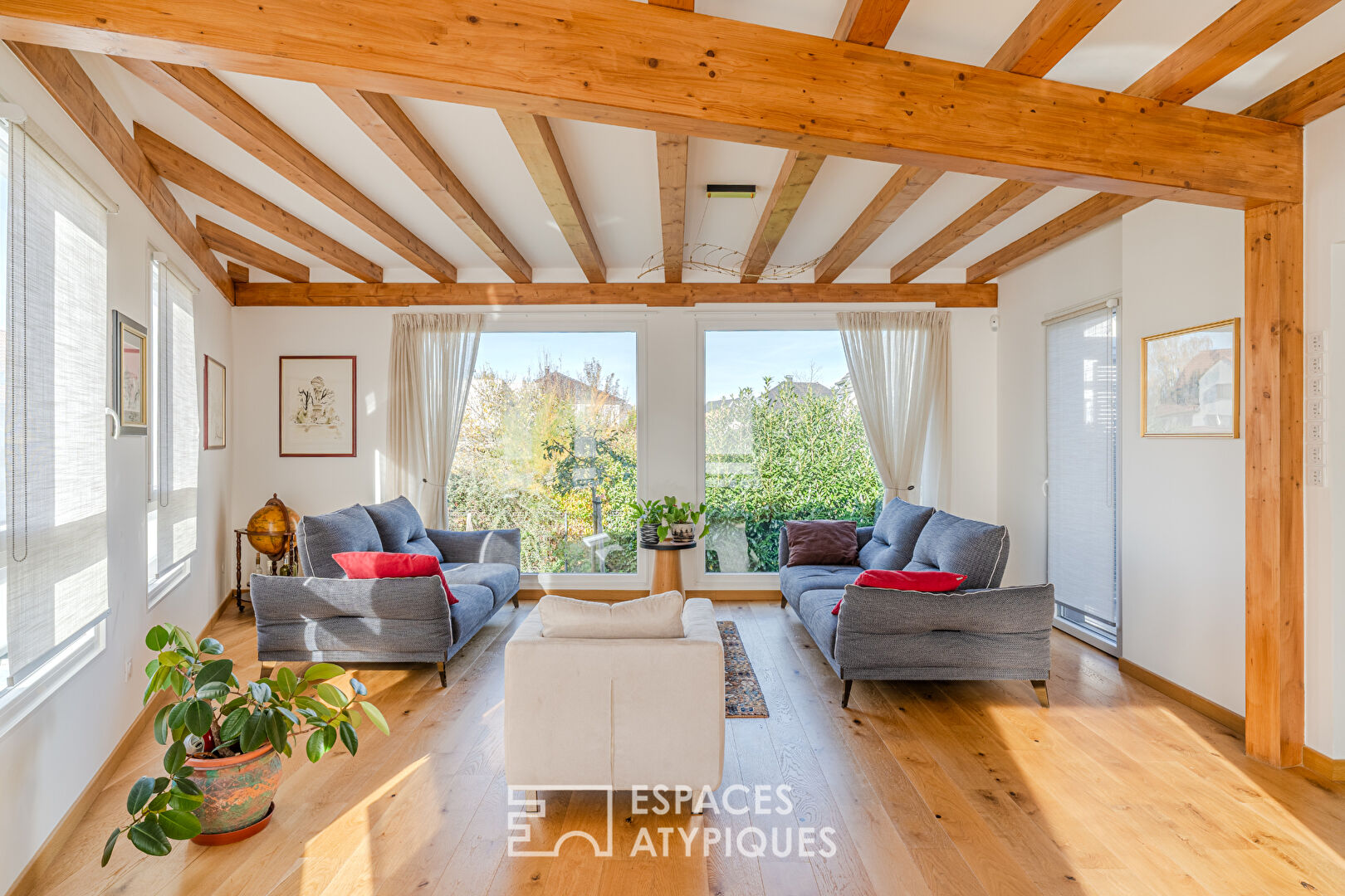 Construite en 2009 et significativement agrandie en 2021, cette maison déploie 175 m² sur un terrain paysagé et clos de 6 ares. Elle séduit par son architecture contemporaine, ses volumes généreux et sa magnifique terrasse abritée d'une pergola bioclimatique, au coeur d'un jardin soigné où une piscine trouvera aisément sa place. Les récentes améliorations, incluant une façade refaite, une pompe à chaleur et 30 panneaux solaires, soulignent la qualité des prestations. L'entrée mène à un vaste espace de vie où la lumière circule librement. Le salon-séjour avec cheminée dialogue avec une cuisine ouverte et équipée. Dans la continuité, l'extension offre une seconde pièce de vie de plus de 32 m², idéale pour un salon de lecture ou une bibliothèque, totalement tournée vers le jardin. Une buanderie fonctionnelle complète ce niveau. L'escalier mène aux demi-niveaux supérieurs dédiés au repos. Le premier accueille une confortable suite parentale avec son dressing. Le second distribue trois autres chambres et une salle de bain moderne dotée d'une baignoire et d'une douche. L'espace extérieur constitue un atout majeur. La terrasse de 28 m² sous pergola, avec toit et rideaux rétractables, crée une véritable pièce supplémentaire en plein air. Le jardin, méticuleusement aménagé, invite à la détente. Un grand garage avec borne de recharge pour véhicule électrique et une cave spacieuse de 64 m² s'ajoutent aux fonctionnalités. La maison bénéficie d'un environnement calme, à proximité immédiate des écoles, du collège et des commodités, accessibles en quelques minutes à vélo, tout comme le bac vers l'Allemagne. Une réalisation contemporaine et fonctionnelle, pensée pour le confort familial, qui allie esthétique soignée et performances énergétiques dans un cadre de vie privilégié. CLASSE ENERGIE : C / CLASSE CLIMAT : C Montant moyen estimé des dépenses annuelles d'énergie pour un usage standard, établi à partir des prix moyens des énergies indexés sur les années 2021, 2022, 2023 (abonnements compris) : entre 1890 et 2620 euros Contact : Cédric 06.78.54.01.95 Cédric RICCIO (EI) Agent Commercial - Numéro RSAC : 908744840 - Strasbourg.