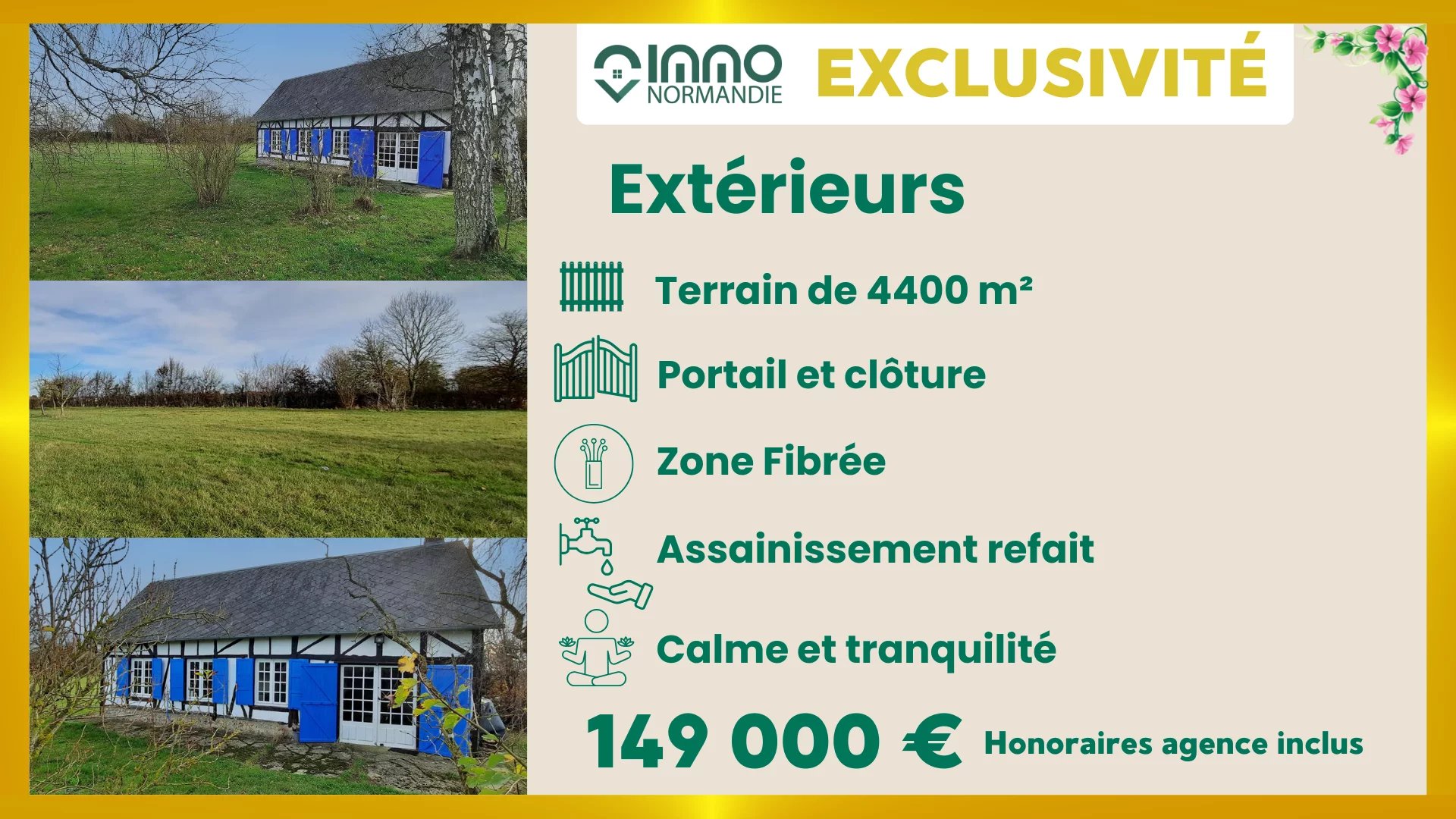 EXCLUSIVITÉ - EXCLUSIVITÉ - EXCLUSIVITÉ - EXCLUSIVITÉ C'est au cœur de la campagne Normande que l'Agence Immo Normandie vous propose cette maison pleine de charme. Ayant gardé son authenticité (tommettes et colombages), cette charmante maison de campagne sera un véritable havre de paix. Un beau séjour très lumineux ( lumière traversante) avec sa cheminée et son insert vous invite à la contemplation. Le côté pratique : une cuisine ouverte un couloir desservant une sale de douche avec toilettes (fenêtre) ainsi qu'une chambre et un bureau attenant (possibilité de réunir ces deux pièces). A l'étage, vous trouverez un grand espace à interpréter selon vos besoins. LES ATOUTS : - Commerces et services à 8 minutes en voiture. - Maison pleine de charme. - Chambre au RDC avec salle d'eau récente. - Etage offrant 2 beaux espaces de couchage supplémentaires. - Assainissement refait. - Beau terrain de 4400 m². Agence IMMO-NORMANDIE 4 agences Pour vous accompagner dans votre Projet immobilier -- LA BARRE EN OUCHE -- BEAUMONT LE ROGER -- -- BRIONNE -- THIBERVILLE -- Retrouvez toutes nos annonces et vidéos sur notre site www.immonormandie.fr Contact : Benjamin ROMUALD -06.33.72.85.24- entrepreneur individuel (E.I.) agissant en sa qualité d'agent commercial, inscrit au Registre Spécial des Agents Commerciaux sous le numéro RSAC 812 264 455 00013 -