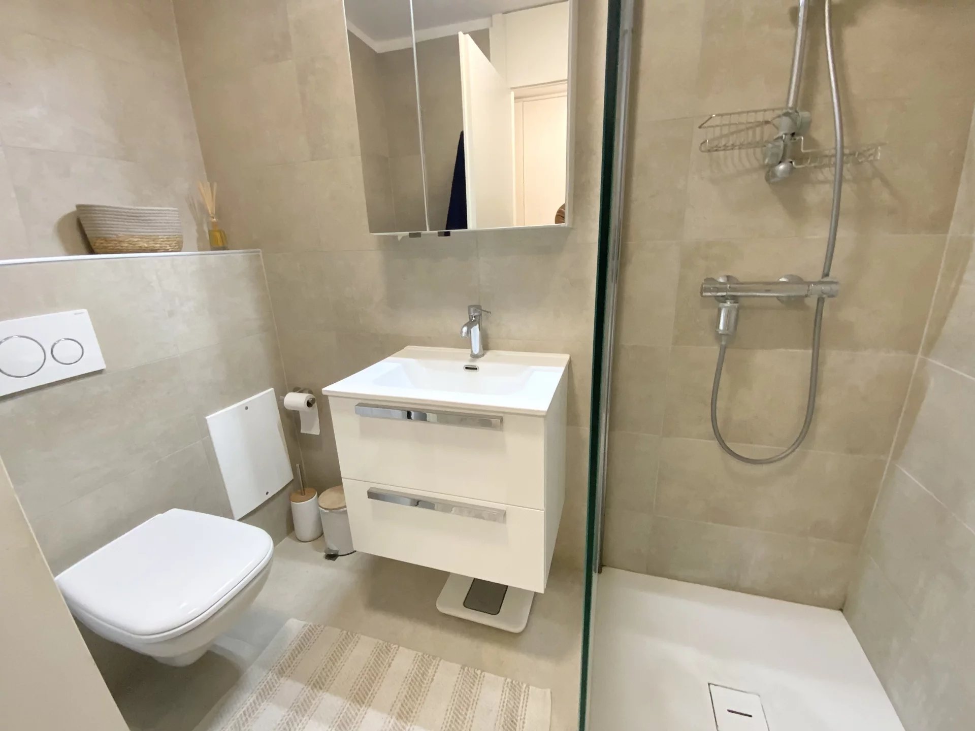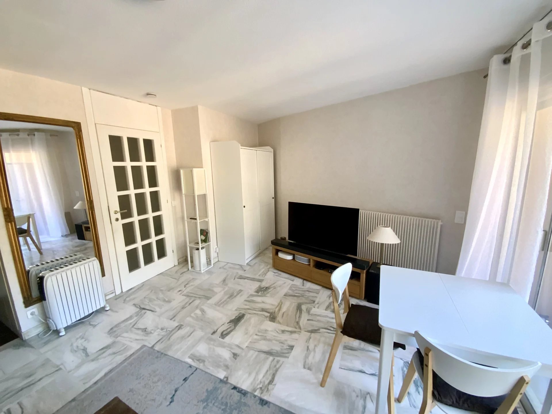 ESCLUSIVITA’ MENTONE GARAVAN, in una residenza fronte mare, a due passi dal centro e sablettes, bel monolocale di 30 m2, situato al quinto piano, terrazza. Venduto con mobile letto design. Cantina. Nelle spese condominiali é incluso il riscaldamento, l’acqua calda e fredda.