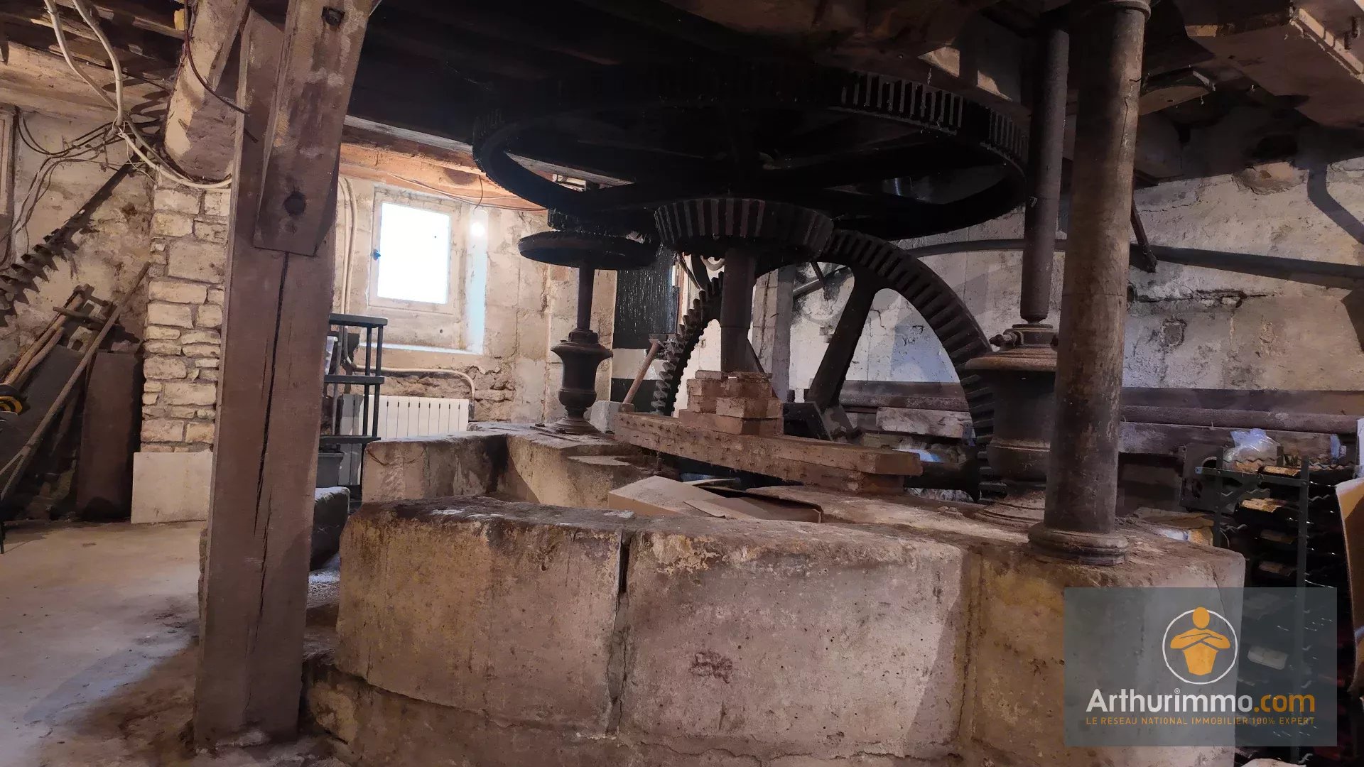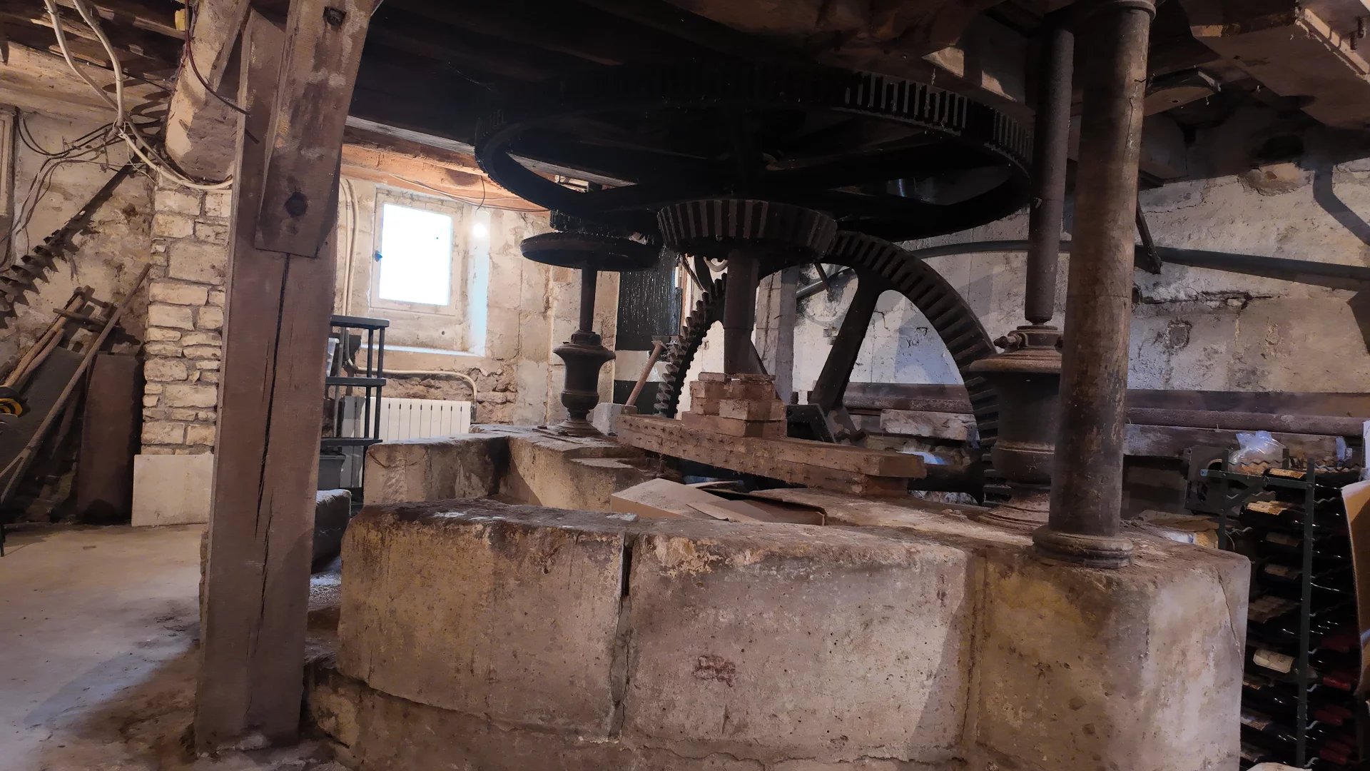 Dans la cave, les anciens rouages du moulin sont toujours présents : un témoignage rare et vivant du passé, qui pourra devenir un espace habitable hors du commun.