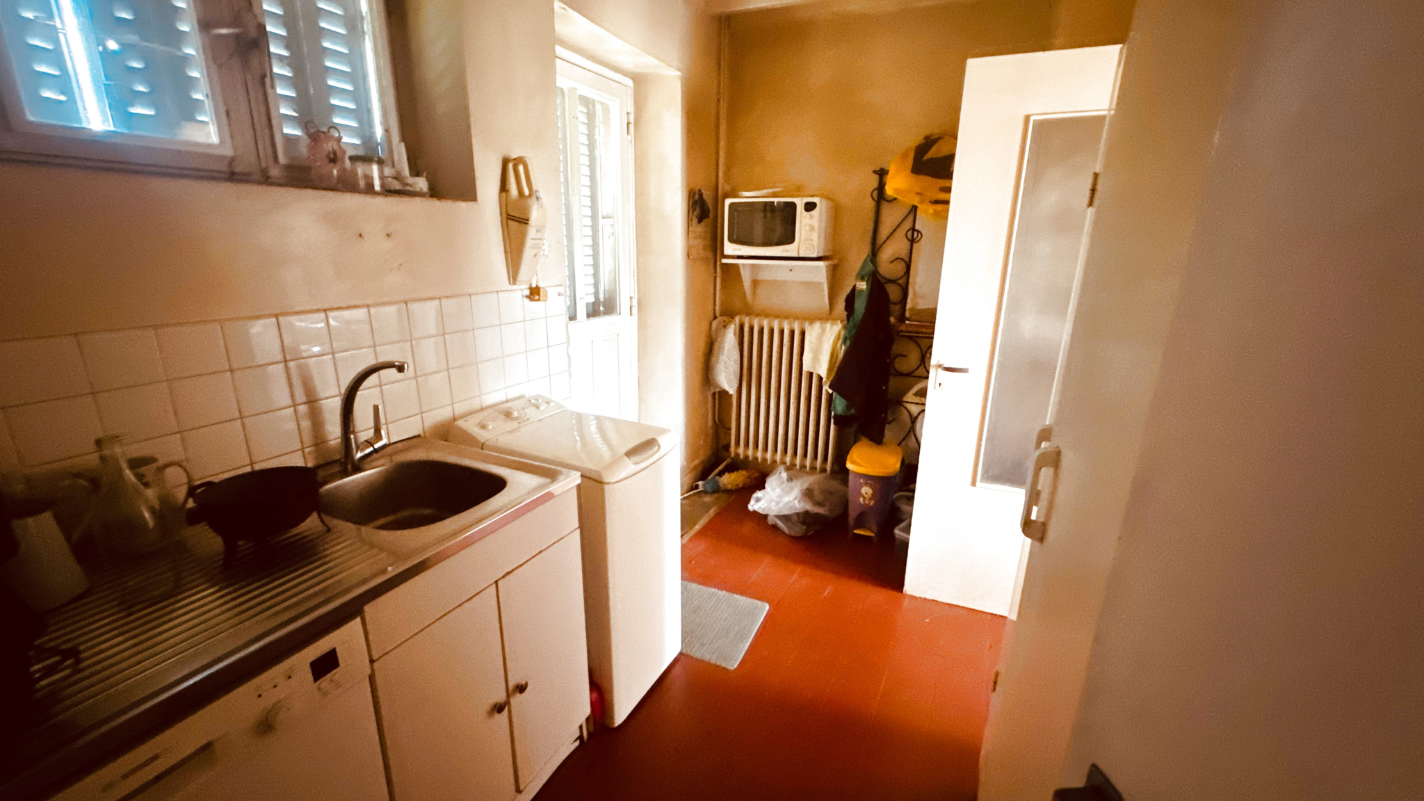 Cuisine nue avec tomettes au sol et poutres blanches apparentes