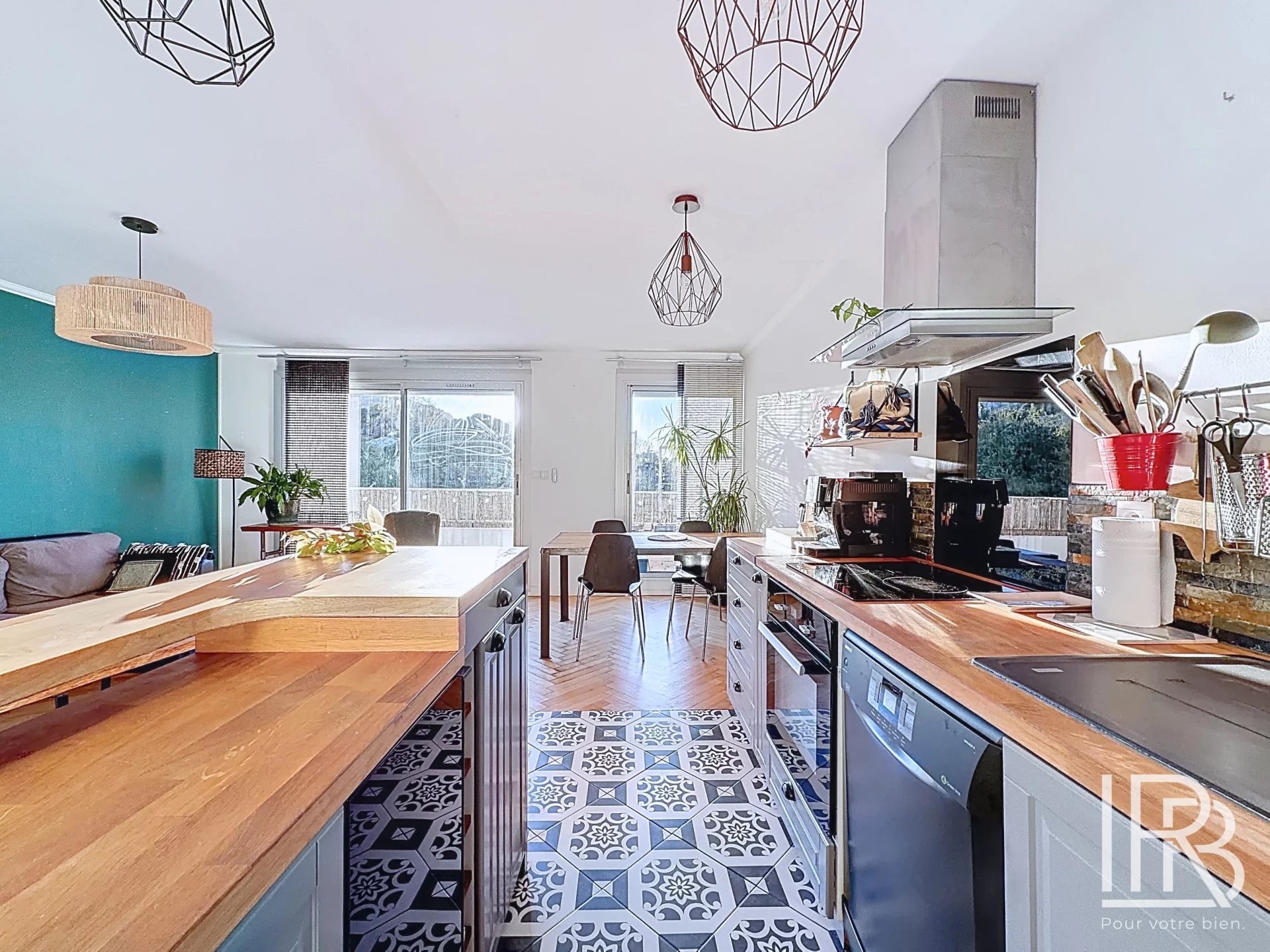 Un grand hall d'entrée avec placard, un salon lumineux ouvrant sur un bel extérieur, une cuisine ouverte sur séjour avec verrière donnant du cachet à la pièce principale.