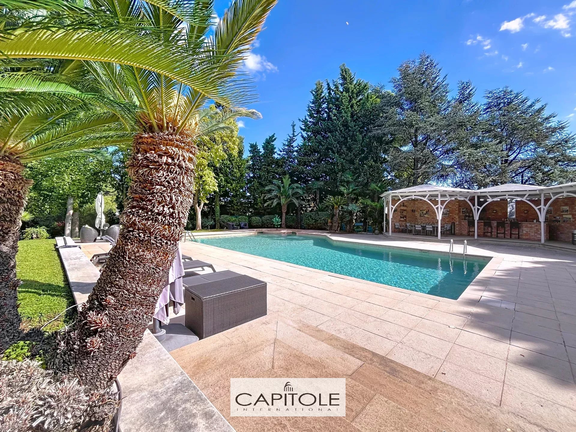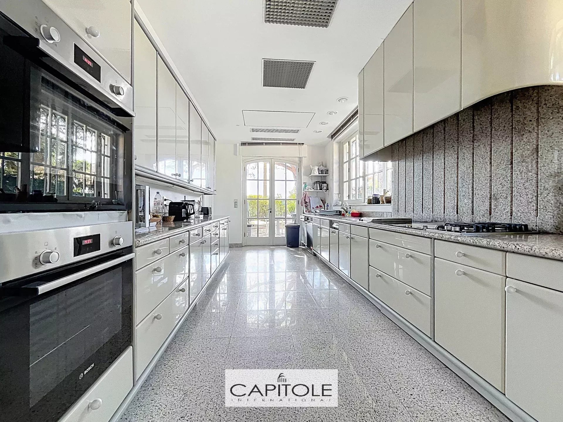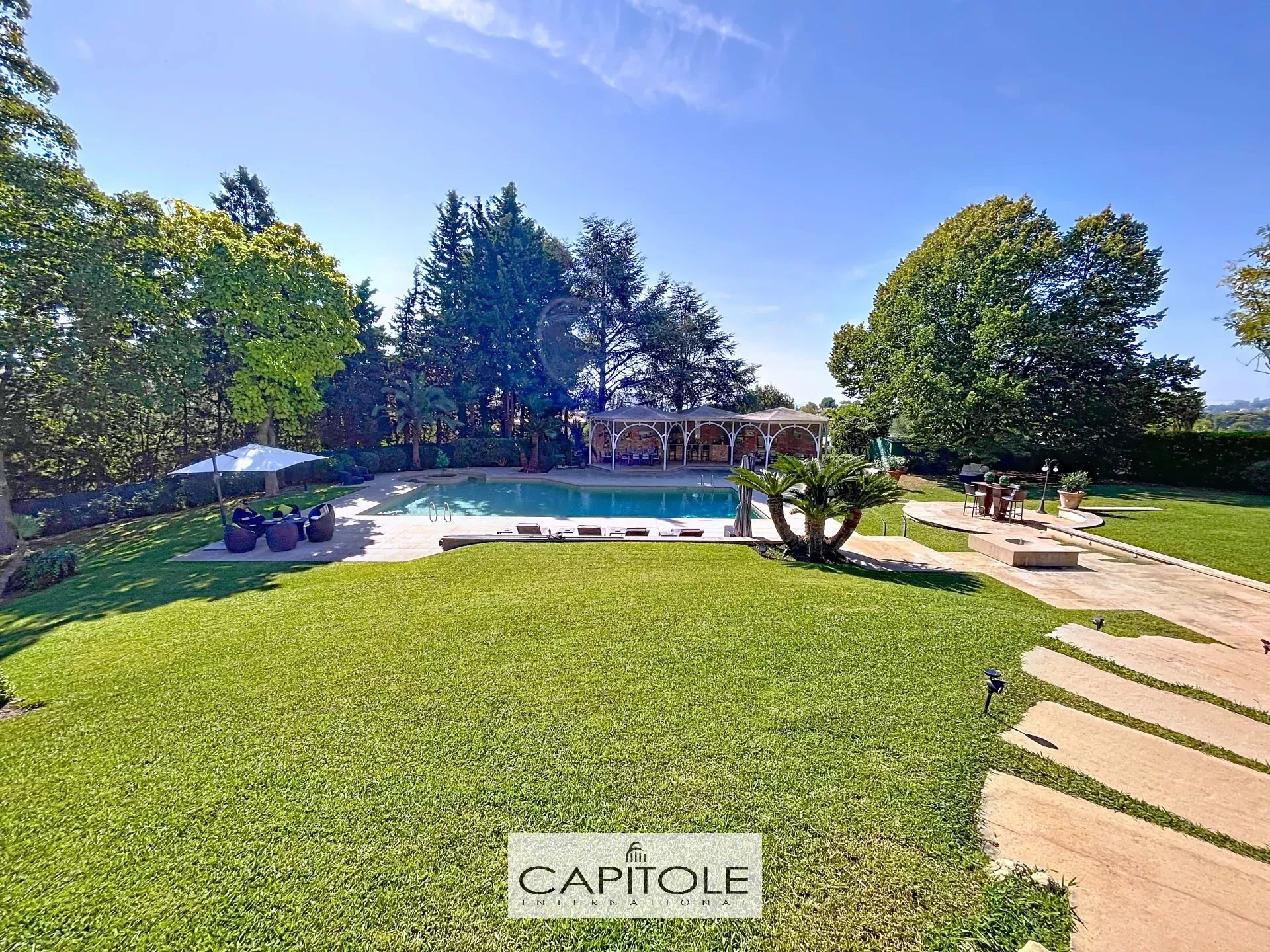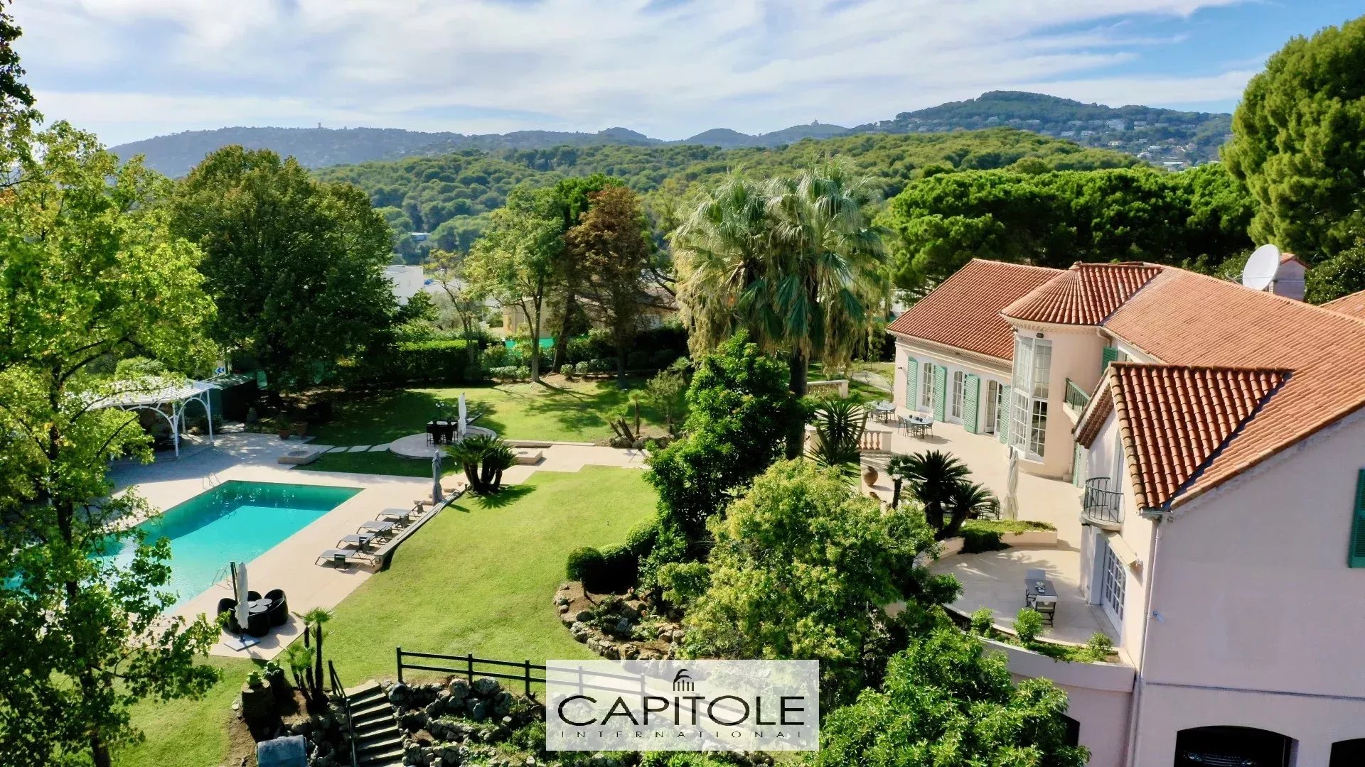 Nichée sur un terrain paysager de plus de 7 300 m², cette élégante propriété de 620 m² offre un cadre de vie d’exception. Pensée aussi bien pour une résidence principale que secondaire, elle séduit par ses volumes généreux, sa luminosité et son atmosphère raffinée. Au rez-de-chaussée, un vaste espace de réception avec hauts plafonds réunit hall d’entrée, salon, séjour et salle à manger, ouverts sur l’extérieur grâce à de larges baies vitrées laissant entrer la lumière naturelle et offrant un aperçu mer. La suite parentale, véritable appartement privé de près de 70 m², dispose de son propre salon, d’un bureau, d’un dressing et d’une terrasse. À l’étage, deux suites parentales avec salles de bains et dressings, deux chambres avec salle de bain commune et balcon vue mer, ainsi qu’une chambre d’appoint indépendante avec salle de douche privative accueillent famille et invités. En rez-de-jardin, la villa propose un appartement pour le gardien, un logement de service, plusieurs chambres pour le personnel, un bureau, une chambre froide et une buanderie. Un garage double et de nombreuses places de stationnement complètent l’ensemble. Le parc, pensé pour la détente et la convivialité, dévoile une piscine avec pool house, un bar lounge, ainsi qu’un terrain de tennis. Un véritable havre de paix au charme unique. Réf: MM1962VM Informations sur les risques disponibles sur le site Géorisques: https://georisques.gouv.fr
