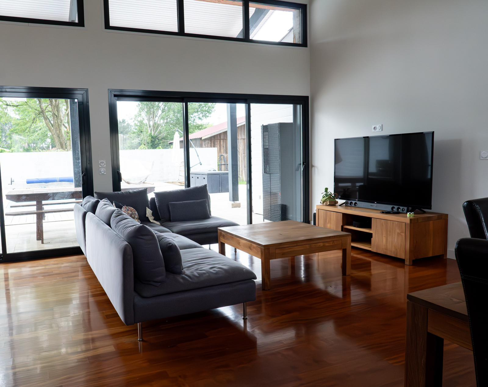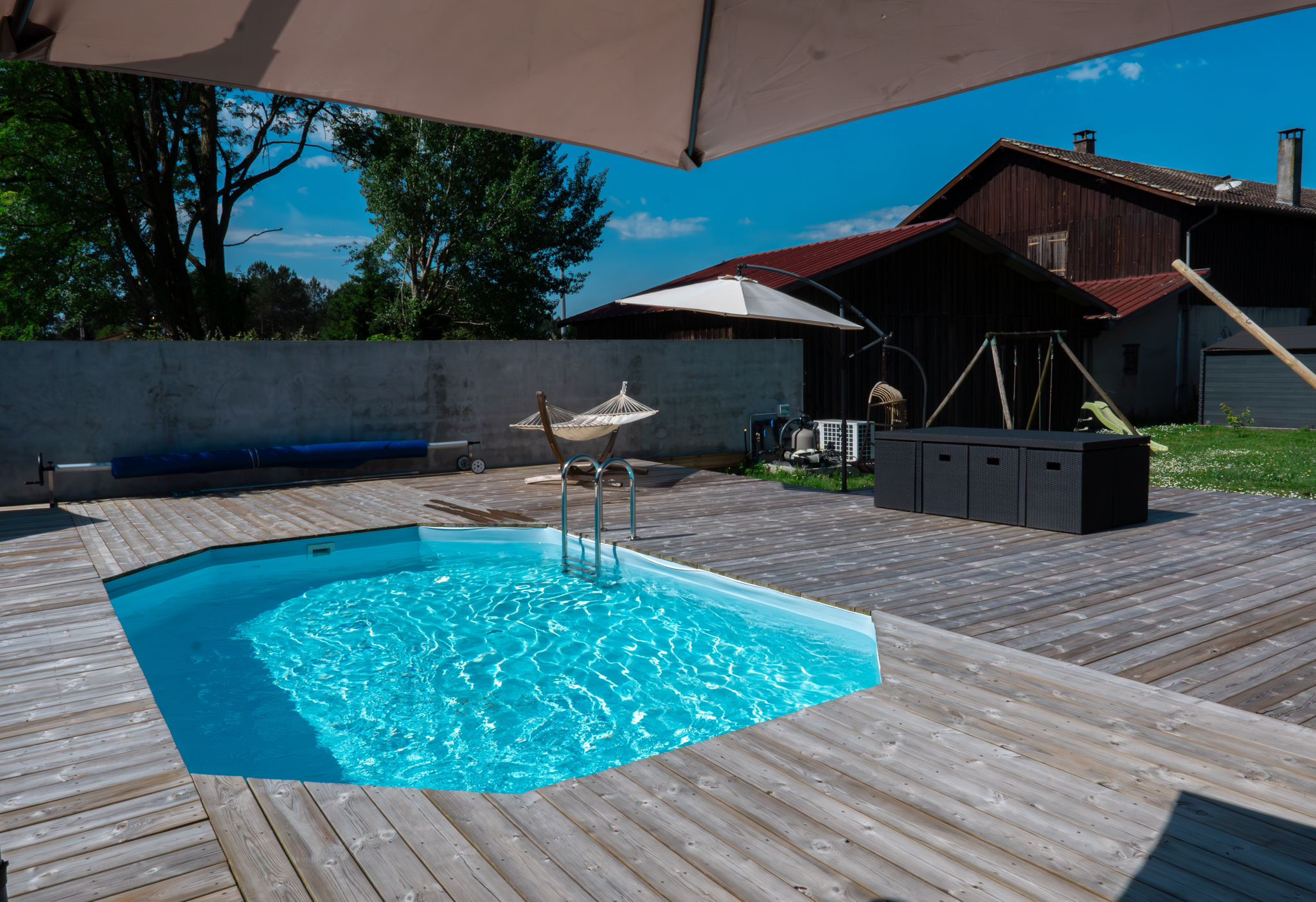La maison se compose de 4 chambres, dont une suite parentale avec salle de bain en travertin comprenant baignoire, douche et WC.La grande pièce de vie, particulièrement lumineuse grâce à de larges ouvertures, s'ouvre sur une vaste terrasse en bois avec piscine intégrée et un coin jacuzzi, idéal pour se détendre en toute saison.La terrasse est complétée par un aménagement soigné comprenant barbecue, transats, hamac et balançoire.