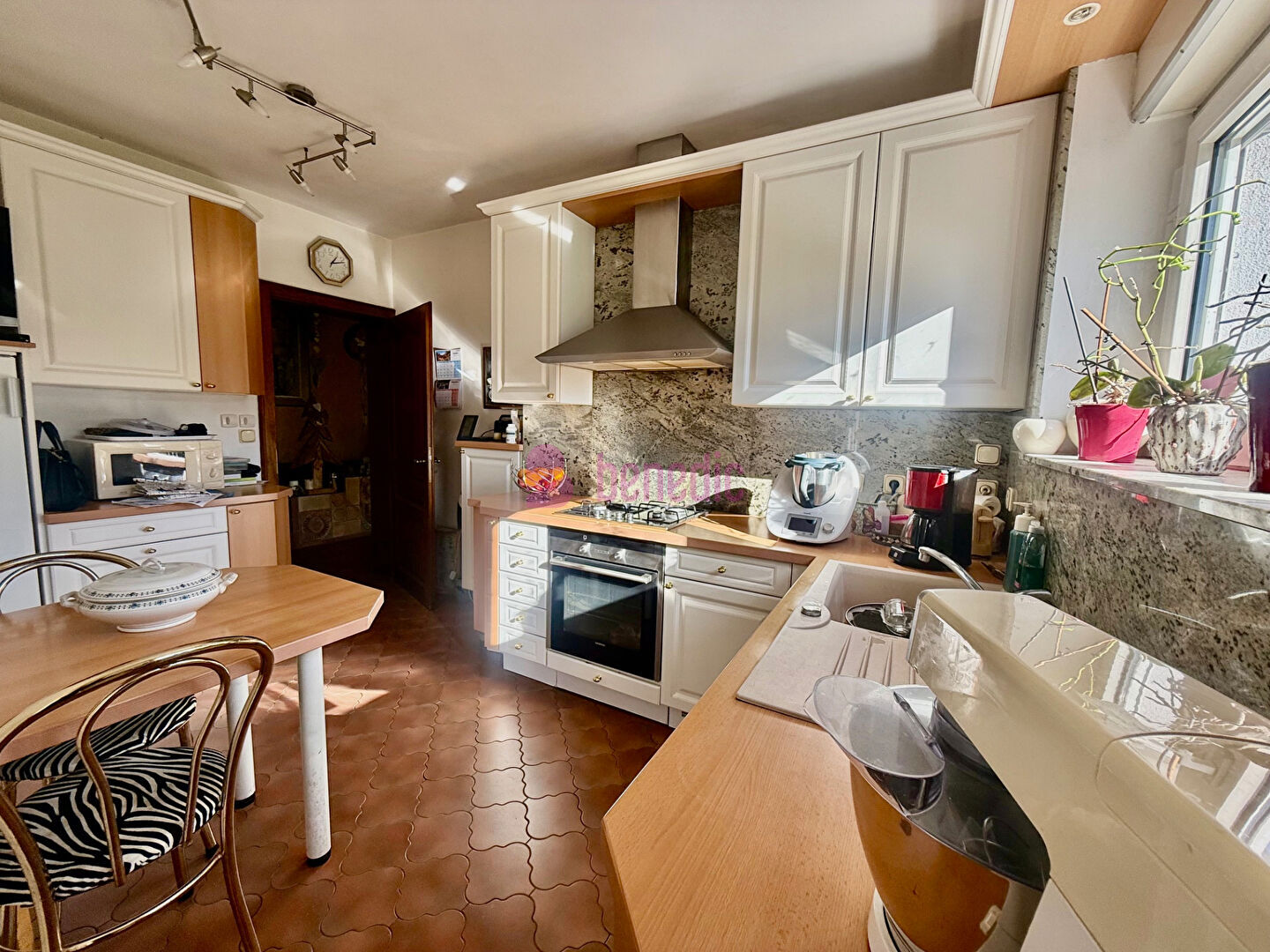 Dans un environnement préservé, cette maison d'architecte, édifiée en 1980, s'impose par son caractère singulier et l'harmonie de ses volumes. Sa superficie est d'environ 107 m2 + une véranda de 25 m2 environ. Implantée sur un terrain d'environ 15 ares, la propriété offre une atmosphère de quiétude à l'abri des regards. La pièce de vie est lumineuse équipée d'une cheminée avec insert et donne accès à une véranda. La cuisine est indépendante et aménagée. La partie nuit accueille trois chambres, une salle de bains et un WC séparé. La maison se déploie sur un sous-sol aménagé (buanderie, chaufferie, douche, WC) comportant un garage deux voitures. L'alliance du chauffage au sol gaz et de la cheminée avec insert garantit un confort optimale. Des panneaux solaires chauffent l'eau. Pour tout renseignement complémentaire ou pour organiser une visite, je me tiens à votre disposition. Frédérique SCHAEFFER Cabinet BENEDIC Sarreguemines 06 60 75 42 08 (5.00 % honoraires TTC à la charge de l'acquéreur.) Frédérique SCHAEFFER (EI) Agent Commercial - Numéro RSAC : 894440684 - Sarreguemines.