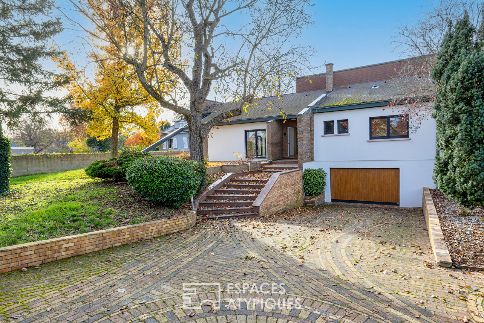 Située à proximité immédiate de Colmar, cette maison d'architecte de 196 m² édifiée sur un terrain de 14 ares offre un cadre de vie exceptionnel. Issue d'une rénovation globale de haute qualité réalisée en 2021, elle séduit par ses volumes, sa luminosité et ses prestations haut de gamme. L'agencement fonctionnel et les matériaux nobles, tels que le parquet massif, définissent l'ambiance sereine et moderne des lieux. La vaste terrasse de 100 m² et le jardin paysagé promettent d'agréables moments en extérieur. Dès l'entrée, agrémentée d'une cheminée, le charme opère avec une spacieuse pièce de vie baignée de lumière, grâce à de grandes ouvertures motorisées. Elle accueille un salon-séjour et une cuisine ouverte, aménagée et équipée d'électroménager premium. L'espace principal se prolonge sur un même niveau vers l'espace nuit, offrant une vie de plain-pied. Celui-ci distribue trois belles chambres climatisées, dont une suite parentale complète avec dressing et salle de bain. Une seconde salle de bain dessert les deux autres chambres. L'étage abrite une mezzanine intimiste avec un espace bureau, ainsi qu'une chambre supplémentaire dotée de sa propre salle d'eau. Le sous-sol complet et fonctionnel abrite un vaste garage, une cave à vin aménagée pour la dégustation, plusieurs caves de rangement, une buanderie et la chaufferie. Le confort est assuré par un plancher chauffant au rez-de-chaussée, une pompe à chaleur et un ballon d'eau chaude sur panneaux solaires. Le jardin, exposé Sud-Ouest et doté d'un accès direct depuis le sous-sol, bénéficie d'un ensoleillement optimal. Un permis de construire a déjà été accordé pour l'aménagement d'une piscine. L'environnement immédiat offre un accès facile aux commerces, écoles et principaux axes routiers. Cette propriété rare, alliant élégance contemporaine et technicité, constitue une véritable opportunité à quelques minutes de Colmar. Commerces à 5 min à pied, vélo Ecoles à 5 min à pied, 2 min à vélo Commerces à 3 min en voiture Aéroport de Bâle/Mulhouse à 35 min en voiture Gare de Colmar à 10 min en voiture Autoroute à 5 min en voiture CLASSE ENERGIE : B / CLASSE CLIMAT : A Montant moyen estimé des dépenses annuelles d'énergie pour un usage standard, établi à partir des prix moyens des énergies indexés sur les années 2021, 2022, 2023 (abonnements compris) : entre 1560 et 2170 euros Contact : Marc 07.44.88.95.17 Marc CALOGERO (EI) Agent Commercial - Numéro RSAC : 982590853 - Colmar.