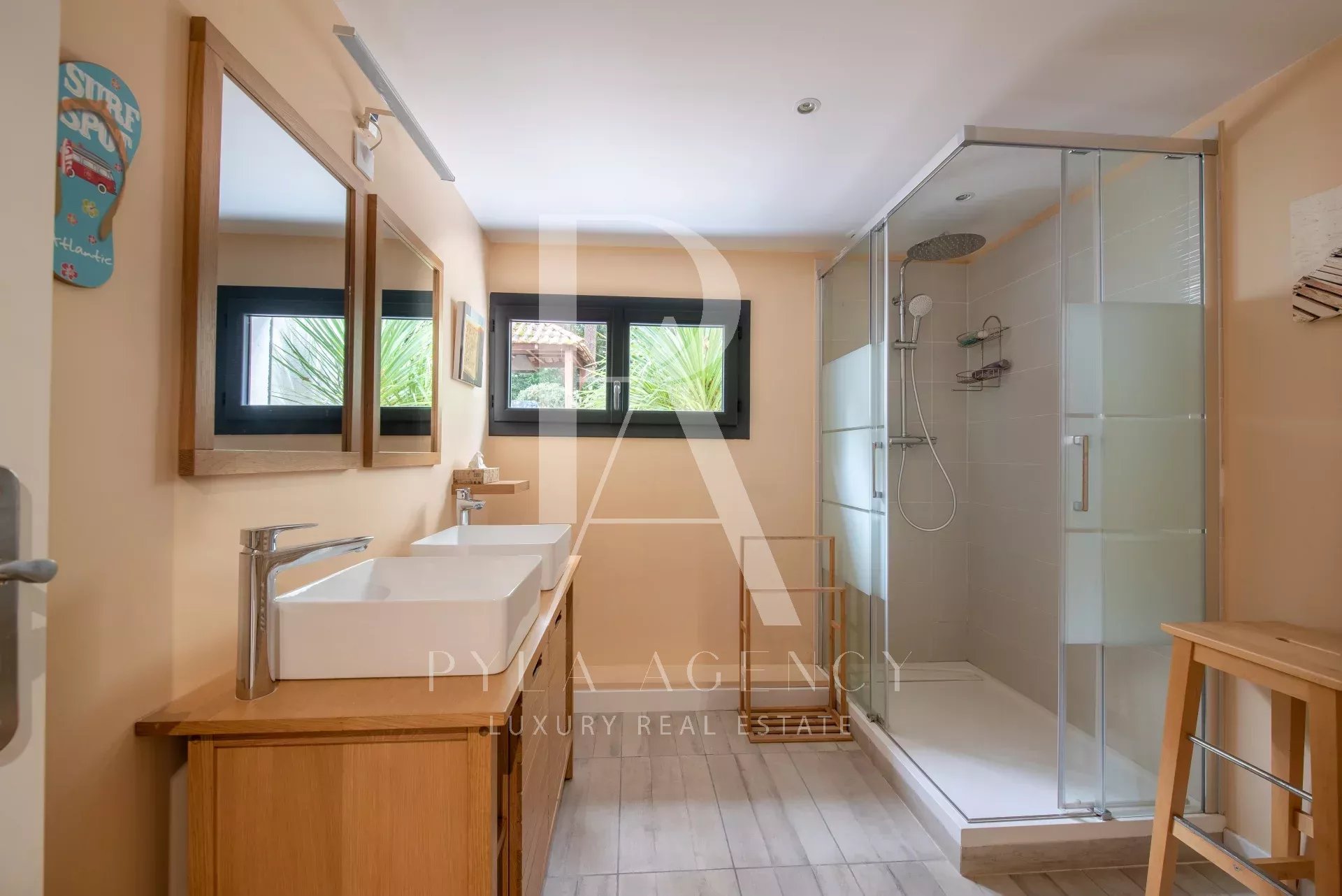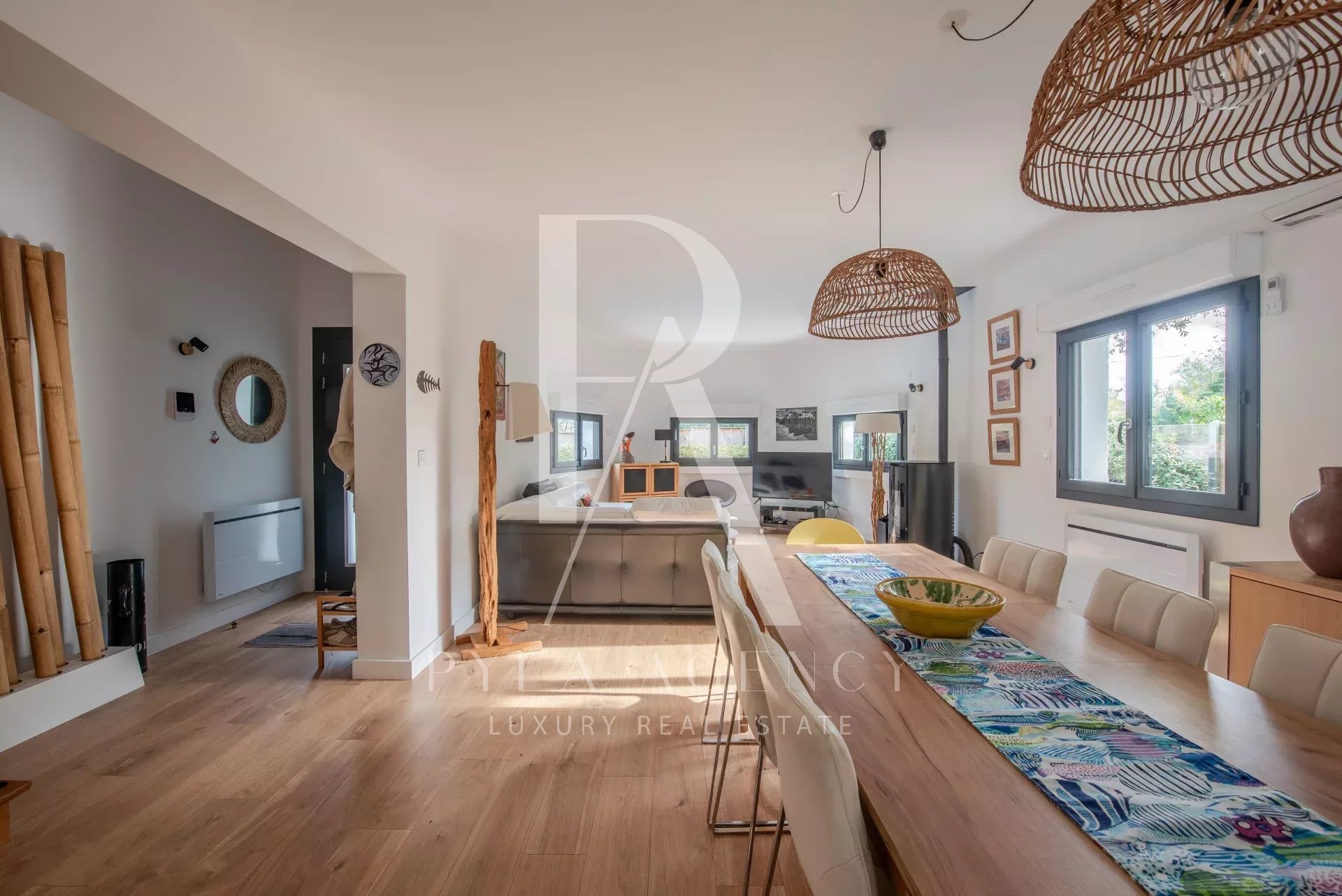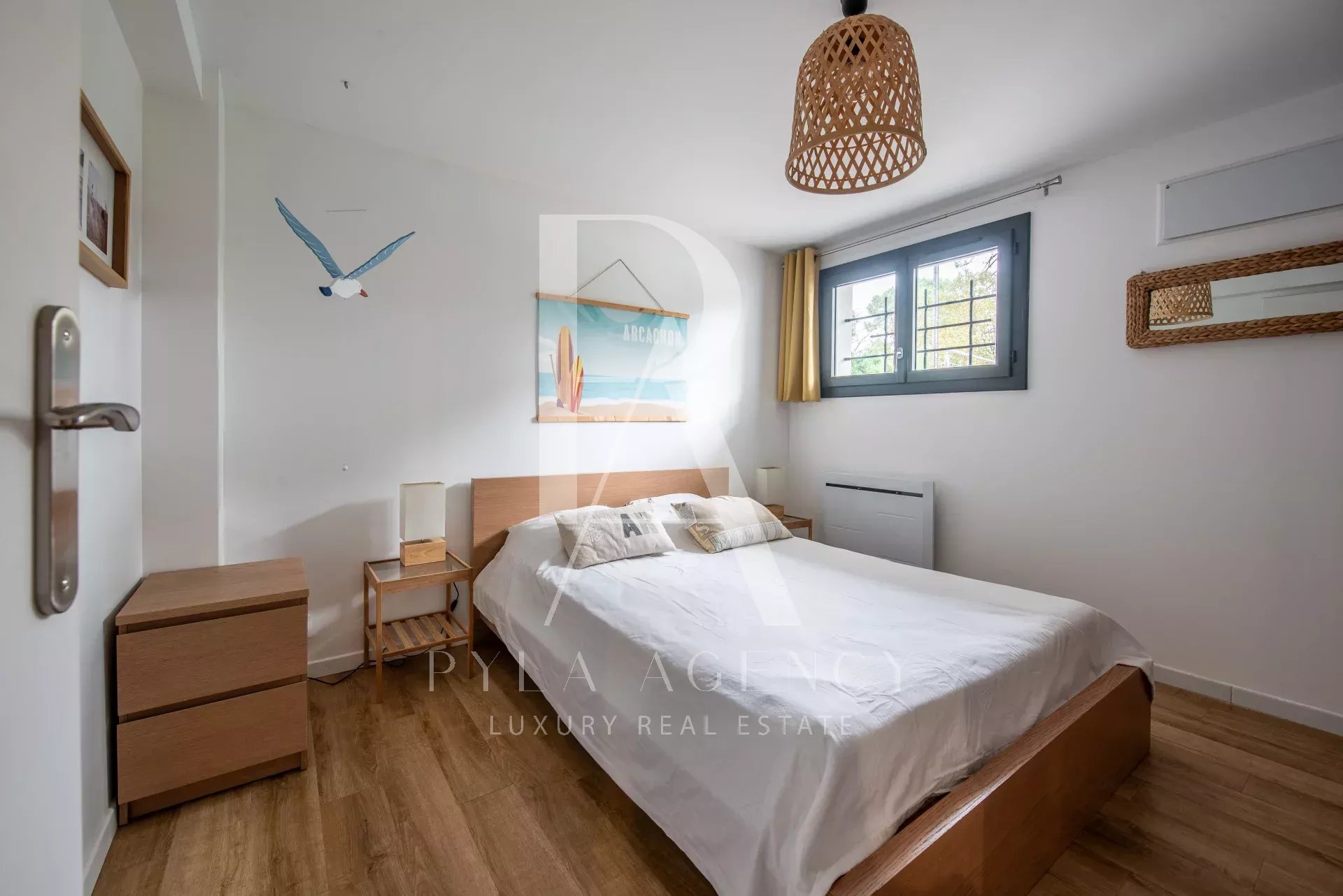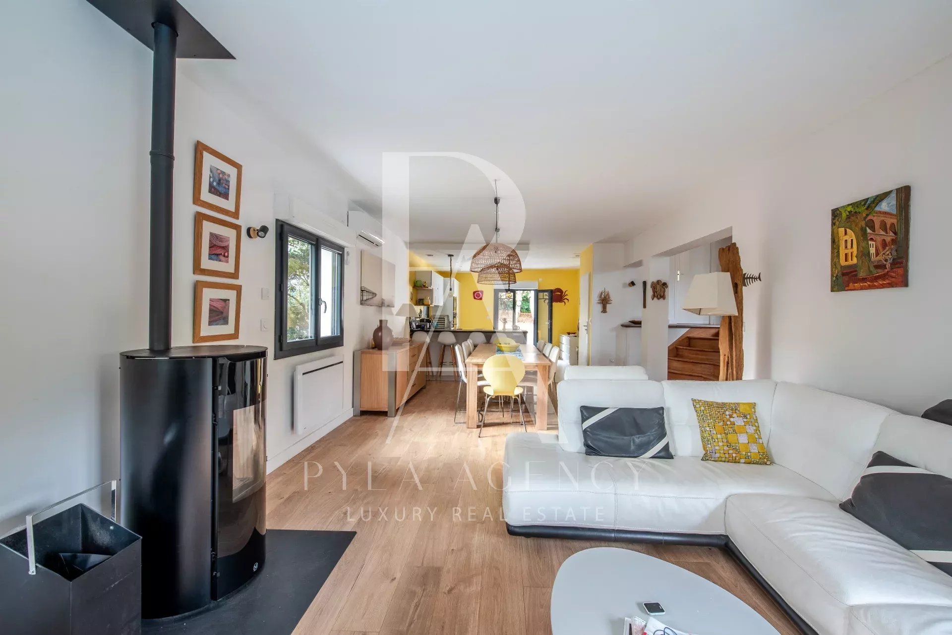Idéalement située dans un environnement recherché du Pyla, cette magnifique villa allie charme, confort et modernité. Rénovée avec goût en 2023, elle offre de belles prestations et un excellent diagnostic énergétique. Son vaste séjour baigné de lumière s’ouvre sur une cuisine contemporaine entièrement équipée, prolongeant naturellement la convivialité vers une large terrasse tournée vers le jardin. La villa dispose de cinq chambres, dont deux suites avec salle d’eau et toilettes privatifs, ainsi qu’un bureau et deux toilettes indépendants. Le confort est assuré toute l’année grâce à la climatisation réversible et au poêle à bois du salon. Sur un terrain arboré de 1 100 m², vous profiterez d’un véritable espace de détente : piscine au sel, boulodrome, et un espace plancha pour des moments chaleureux en plein air. Un cabanon et une dépendance complètent ce bien pour entreposer vos vélos et servir de rangement. Proche des commerces, du golf et des plages, cette propriété bénéficie d’un excellent rendement locatif saisonnier. Venez la visiter sans tarder