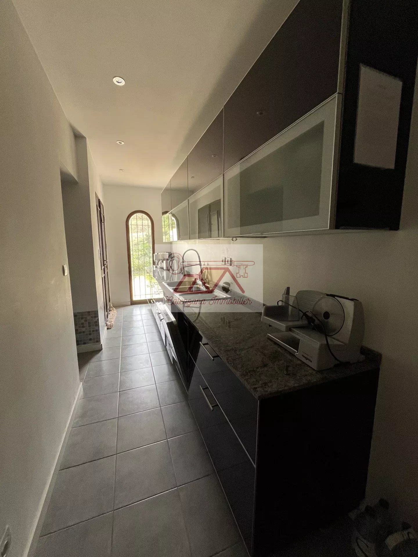 La cuisine indépendante, accessible à la fois depuis un couloir et depuis un vaste laboratoire professionnel, s’ouvre directement sur un patio en pierre apparente qui crée un espace extérieur chaleureux et authentique. Une arrière-cuisine ainsi qu’une buanderie complètent cet ensemble parfaitement aménagé.