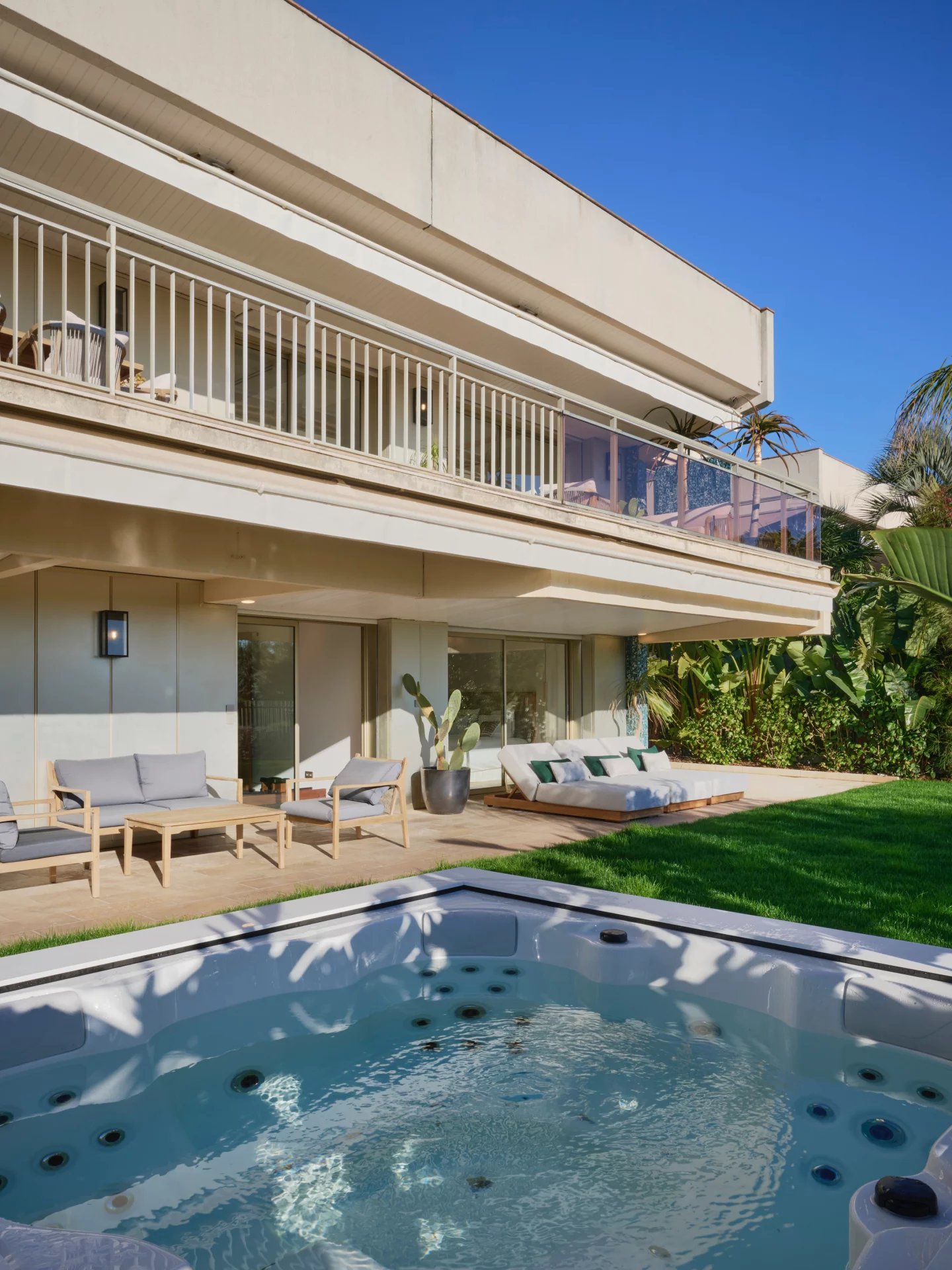 Au rez de jardin salon d'été et 3 belles chambres avec leurs salle de douche, et un belle salle de fitness équipée ,l'ensemble de ce niveau donne sur un beau jardin avec un jacuzzi et un accès sur le parc pour aller à la piscine et tennis de la résidence .