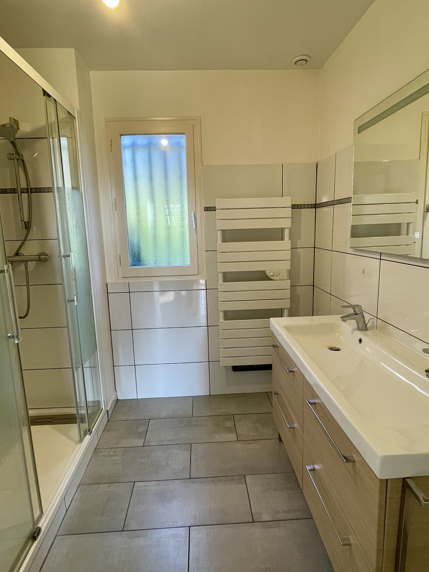Cette maison se compose au rez-de-chaussée, d' une entrée desservant une cuisine aménagée et équipée, un séjour de 29 m2, une chambre, une salle d'eau, des toilettes séparés ainsi qu'une arrière-cuisine.
