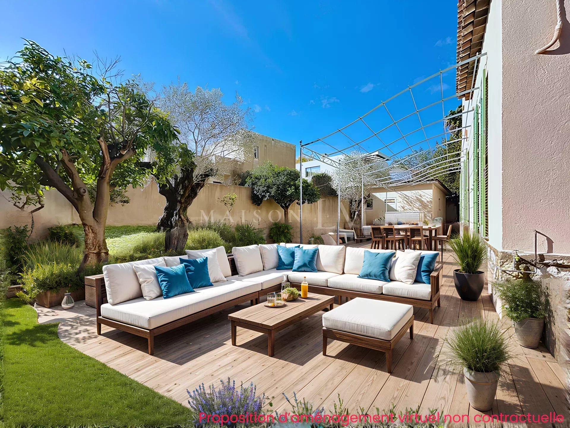 Le jardin verdoyant et la lumière naturelle qui inonde chaque pièce créent une atmosphère chaleureuse et accueillante.