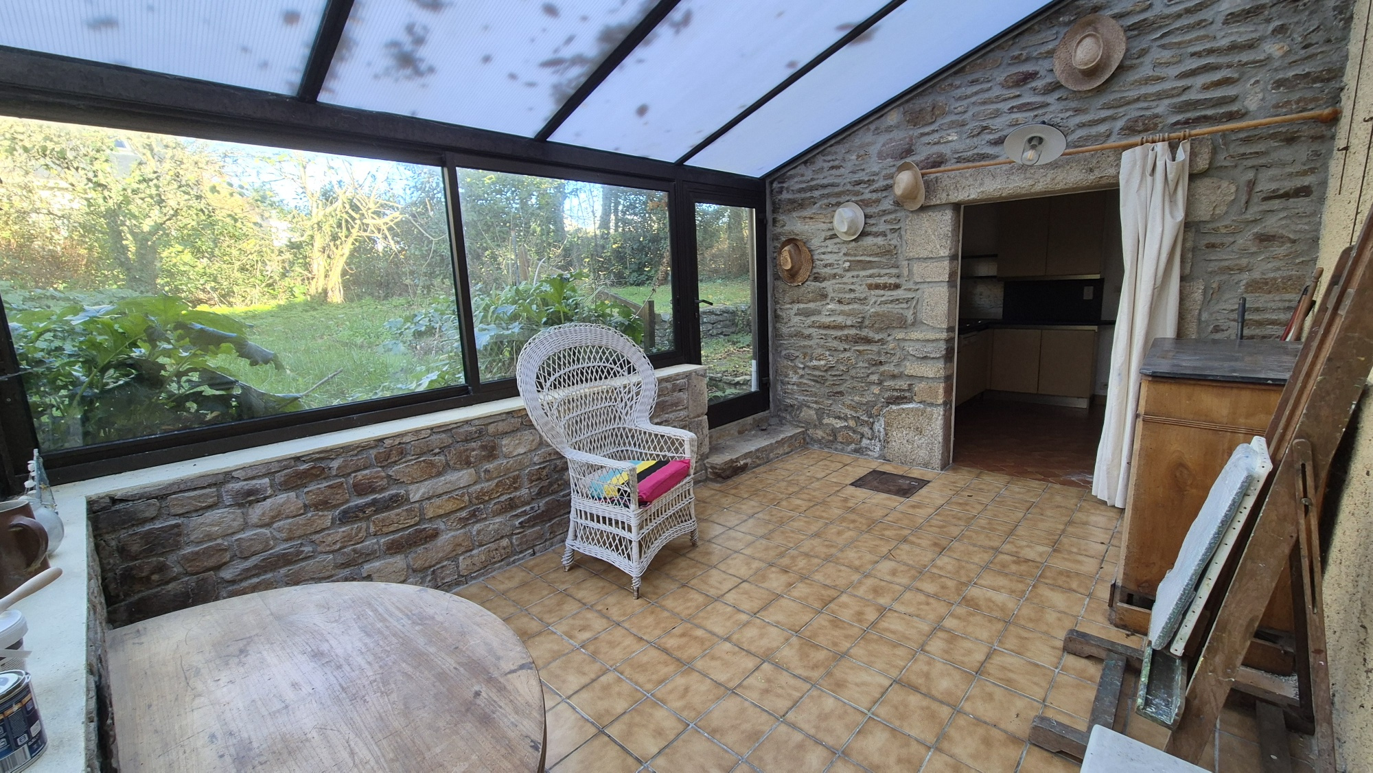 Elle se compose d'une entrée sur séjour avec cheminée, une cuisine, une véranda donnant sur le jardin, une salle de douche, un WC, un bureau (ou petite chambre).