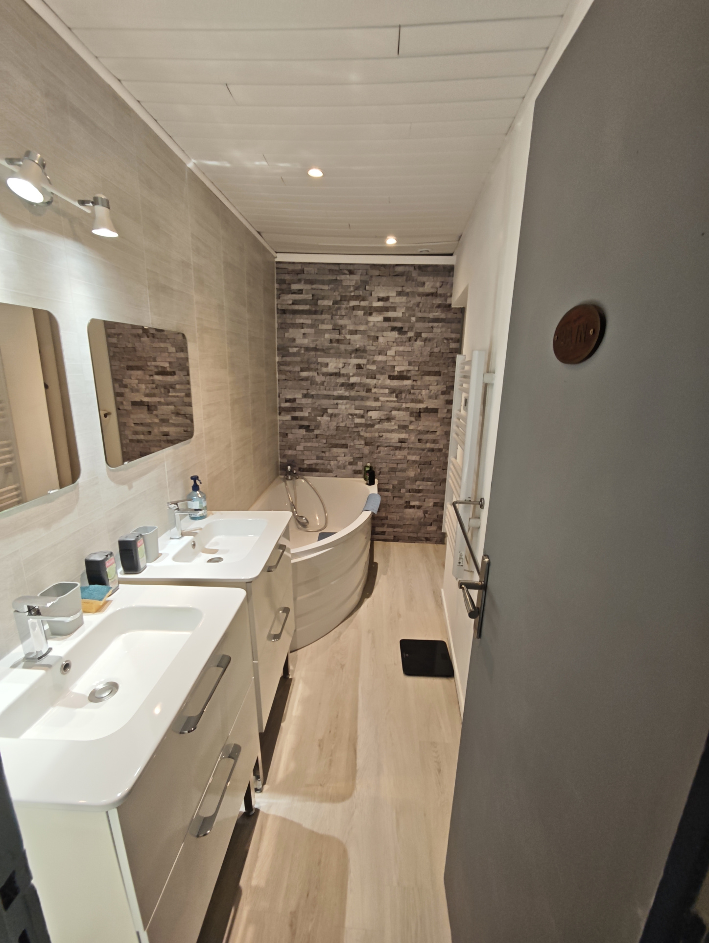 Elle offre un bel espace de vie avec séjour et cuisine ouverte, complété par une buanderie / arrière-cuisine très pratique. Côté nuit, vous trouverez trois chambres, dont une suite parentale avec salle d'eau privative, ainsi qu'une seconde salle d'eau.