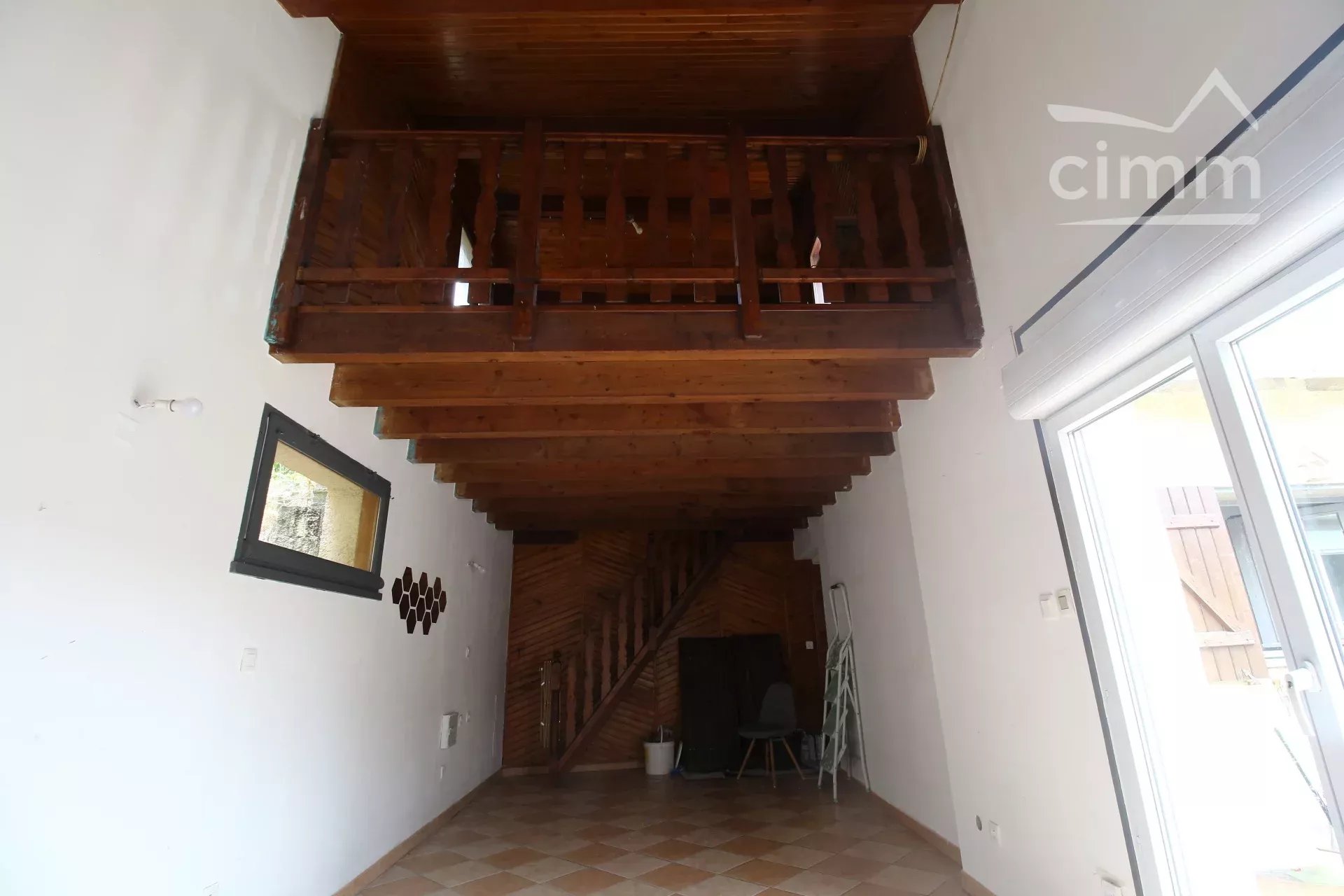 Quelques marches extérieures donnent sur l'habitation, une cuisine salle à manger de 23,5m², 2 chambres de 11 et 14m², un salon de 24,5m² avec un poêle. Une belle mezzanine ouvre sur le jardin.