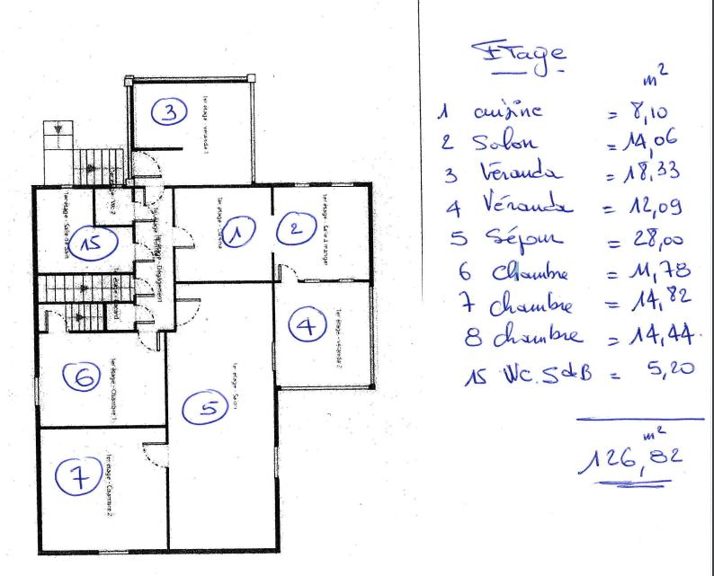 1 : Superficie 126 M2 (dont 30m2 de veranda)- Cuisine équipée (four + plaque avec gaz et induction)