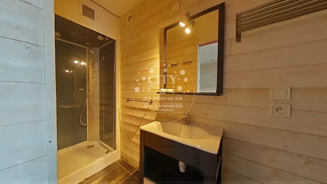 - Une suite parentale avec salle d'eau comprenant un meuble vasque, une cabine de douche et des étagères de rangement