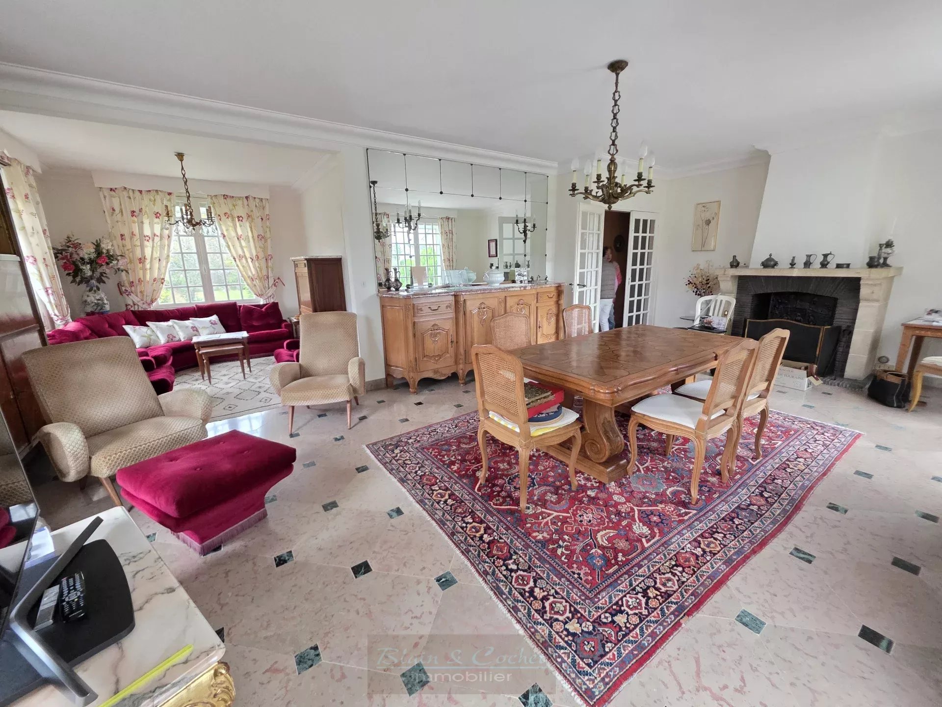 Au rez-de-chaussée, une belle entrée dessert un vaste séjour-salon de 43 m² avec cheminée, agrémenté d’un sol en marbre avec cabochons, d'une cuisine équipée et aménagée ainsi que trois chambres lumineuses et une salle de bains équipée d’une baignoire et d’une douche.