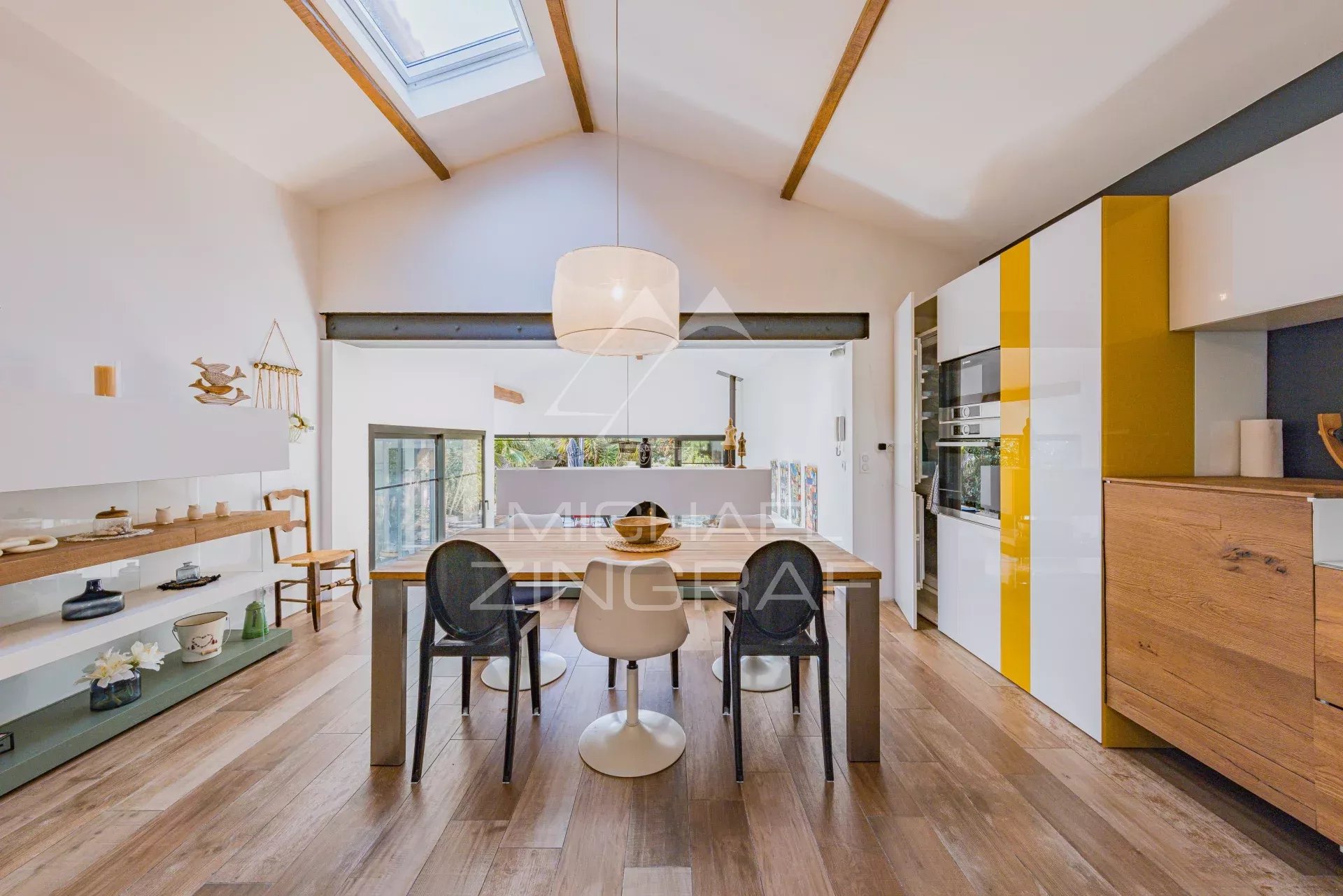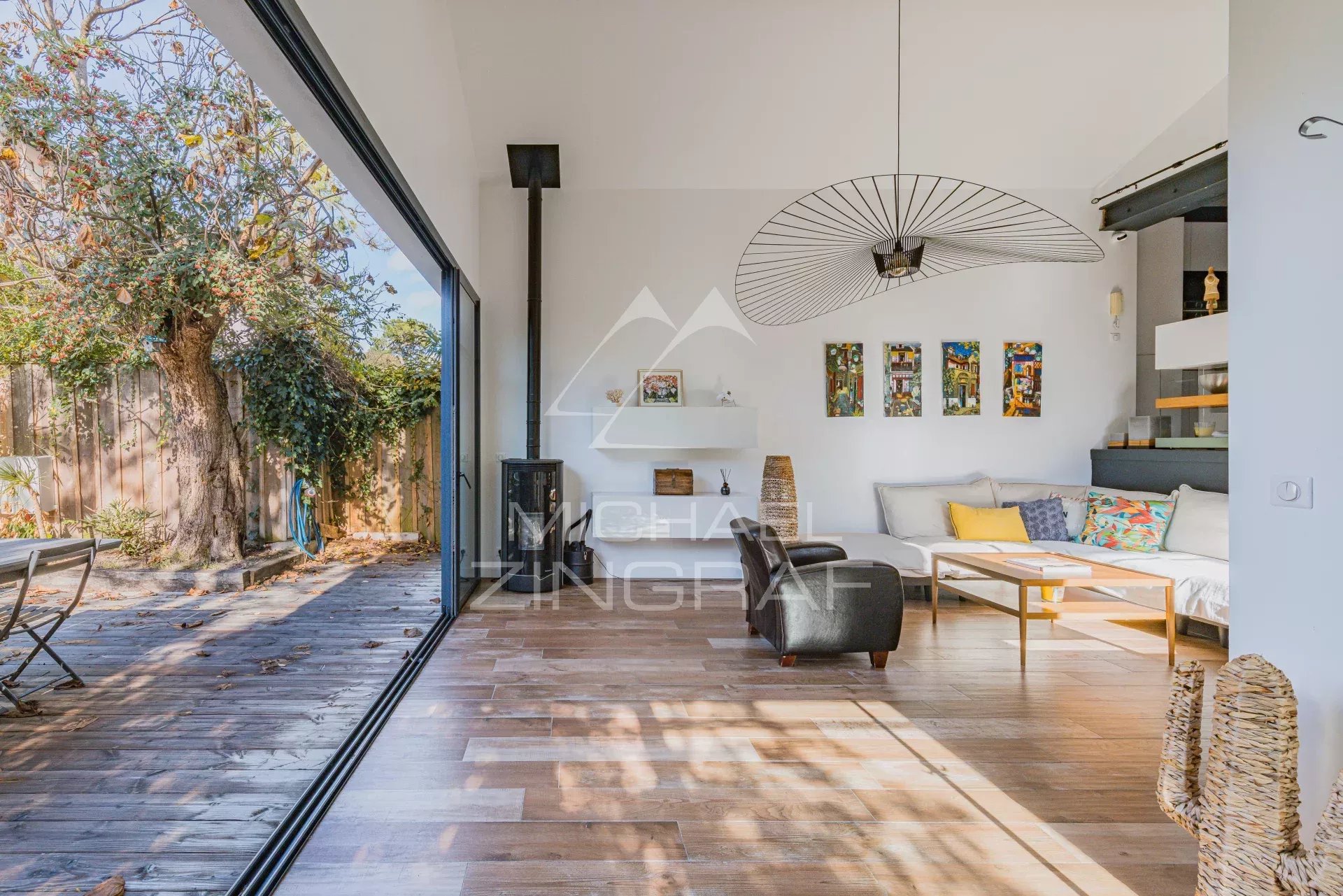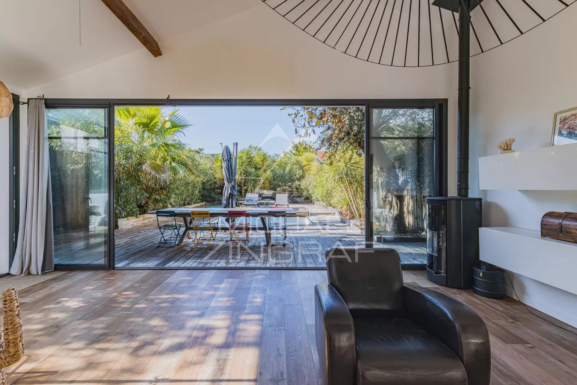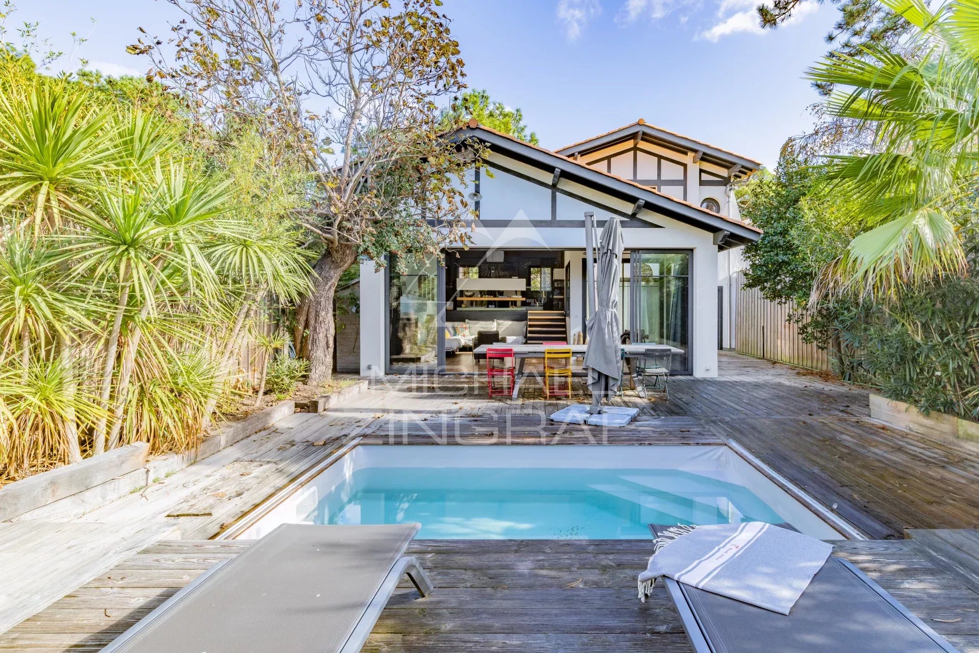 MICHAEL ZINGRAF REALESTATE vous présente entre le village du Moulleau et le Cercle de Voile, au cœur d’un des secteurs les plus prisés du Bassin d’Arcachon, cette villa d’architecte offre une adresse rare à seulement 250 m de la plage et 500 m de la jetée. Une situation idéale pour profiter d’une véritable vie balnéaire « tout à pied », entre plage, commerces, restaurants et animations du Moulleau. La maison séduit par ses volumes et son esprit contemporain. Le vaste séjour cathédrale, prolongé par une cuisine ouverte moderne et une salle à manger conviviale, s’ouvre largement sur la terrasse et la piscine, créant un agréable prolongement dedans/dehors. Un salon télévision indépendant complète cet espace de réception pensé pour accueillir famille et amis dans un confort optimal. La partie nuit propose une suite parentale de plain-pied avec accès direct à la terrasse et salle de bains (douche et baignoire), une chambre d’amis indépendante avec sa salle d’eau, deux suites supplémentaires à l’étage bénéficiant chacune de leur salle d’eau privative, ainsi que deux chambres complémentaires en rez-de-jardin et une buanderie, offrant une capacité d’accueil généreuse et modulable selon les besoins (famille, invités, bureau…). À l’extérieur, un jardin paysager intimiste, une terrasse en bois idéale pour les fins de journée et une piscine composent un véritable lieu de détente. Deux emplacements de stationnement complètent ce bien. Cette villa avec piscine, à quelques pas de la plage du Moulleau et du Cercle de Voile, constitue une opportunité rare pour une résidence secondaire de prestige ou une maison familiale haut de gamme sur le Bassin d’Arcachon.