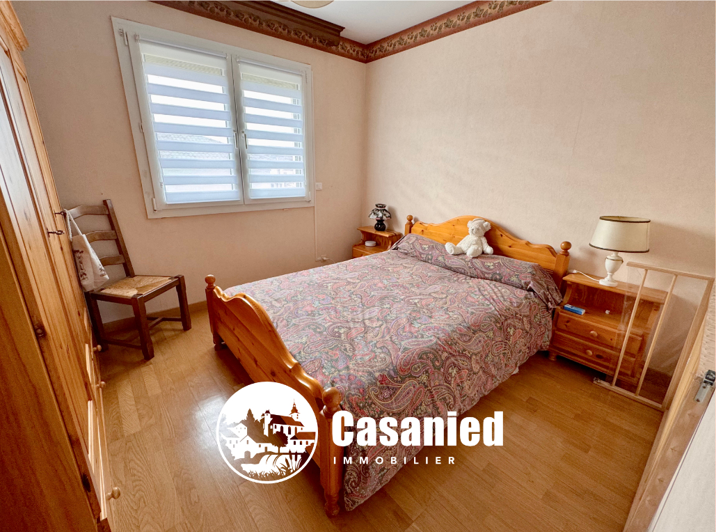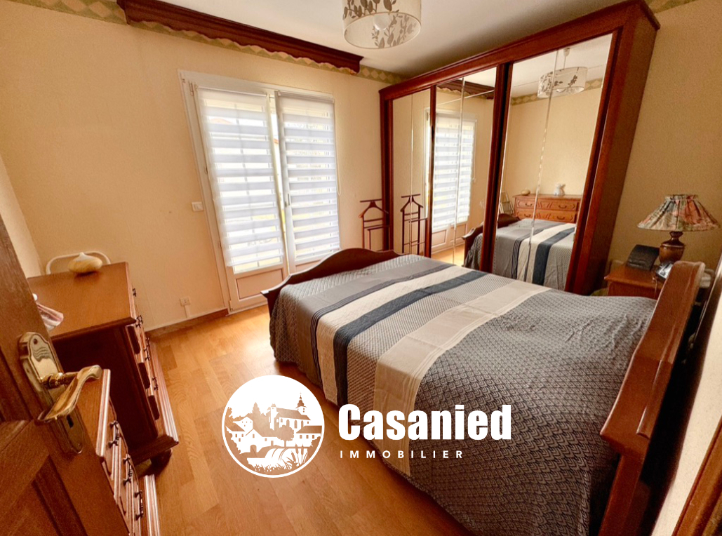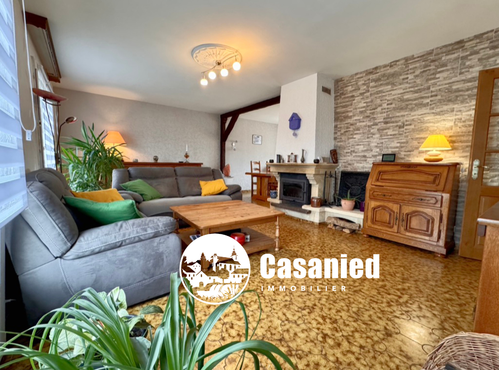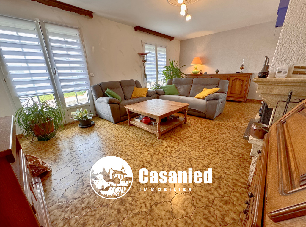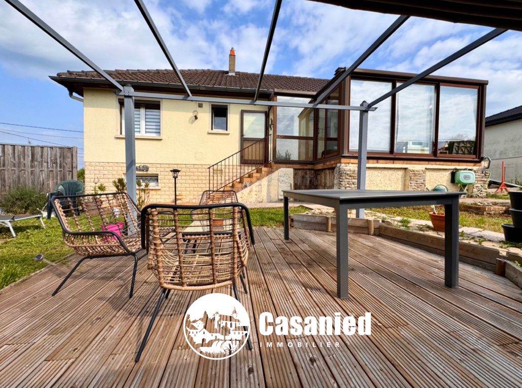 Maison individuelle F5 se composant d'un salon salle manger avec cheminée, une cuisine indépendante équipée donnant sur véranda. 3 chambres, salle de bains, WC indépendant. Sous-sol complet avec garage pour deux voitures, 2 caves, chaufferie/buanderie et salle de douche avec WC.