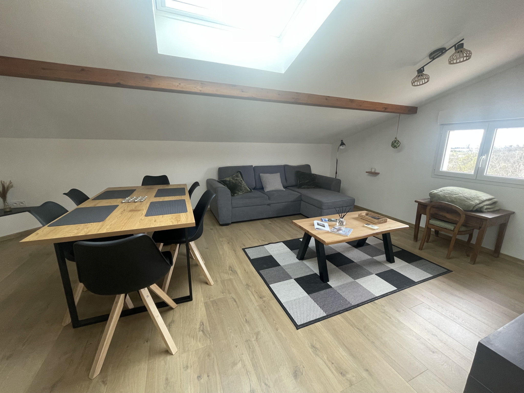 Bel appartement entièrement rénové au premier étage, cuisine ouverte équipée, salon, salle à manger, salle d'eau avec WC, une chambre.