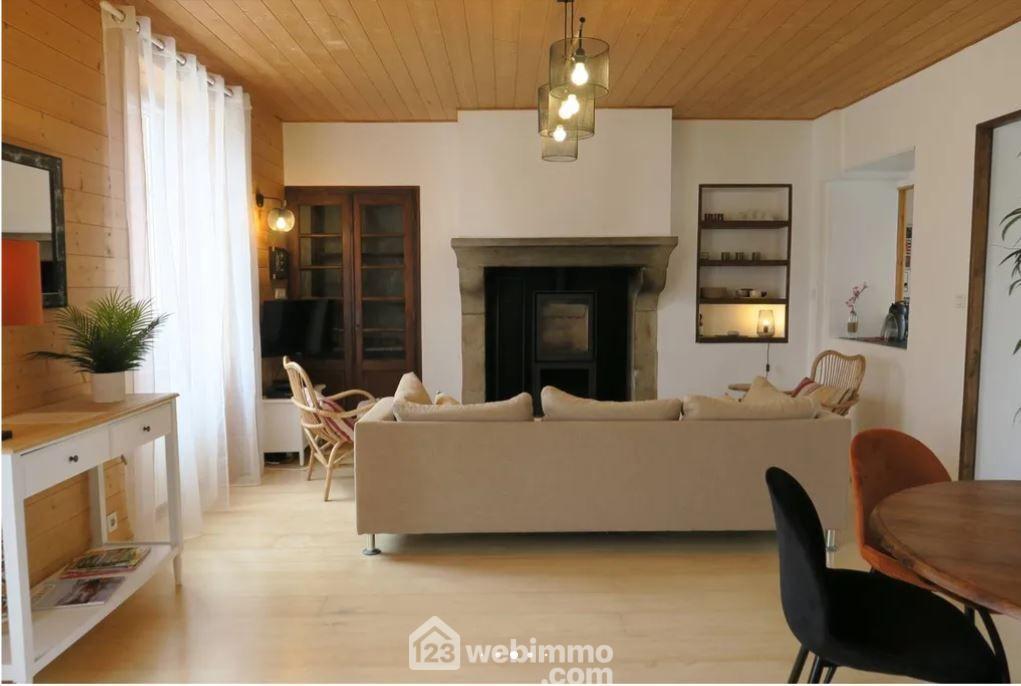 La pièce principale (30 m²), réunissant séjour et salon, conserve sa cheminée ancienne où s'insère un poêle à bois tubé. Une ouverture décorative relie visuellement le salon à la cuisine contemporaine (2020).
