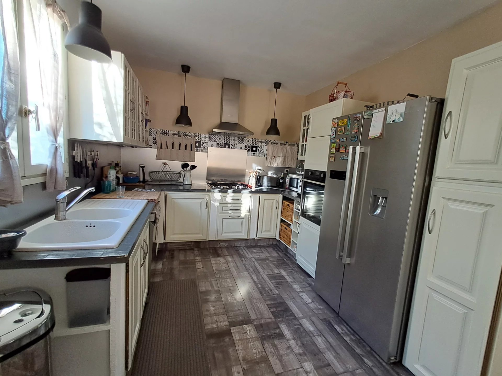 A l'étage nous avons une belle pièce de vie lumineuse avec son coin cuisine équipée ouverte donnant sur une terrasse semi couverte pour toutes les saisons , une cheminée insert , 3 chambres et une salle d'eau avec son WC séparé.