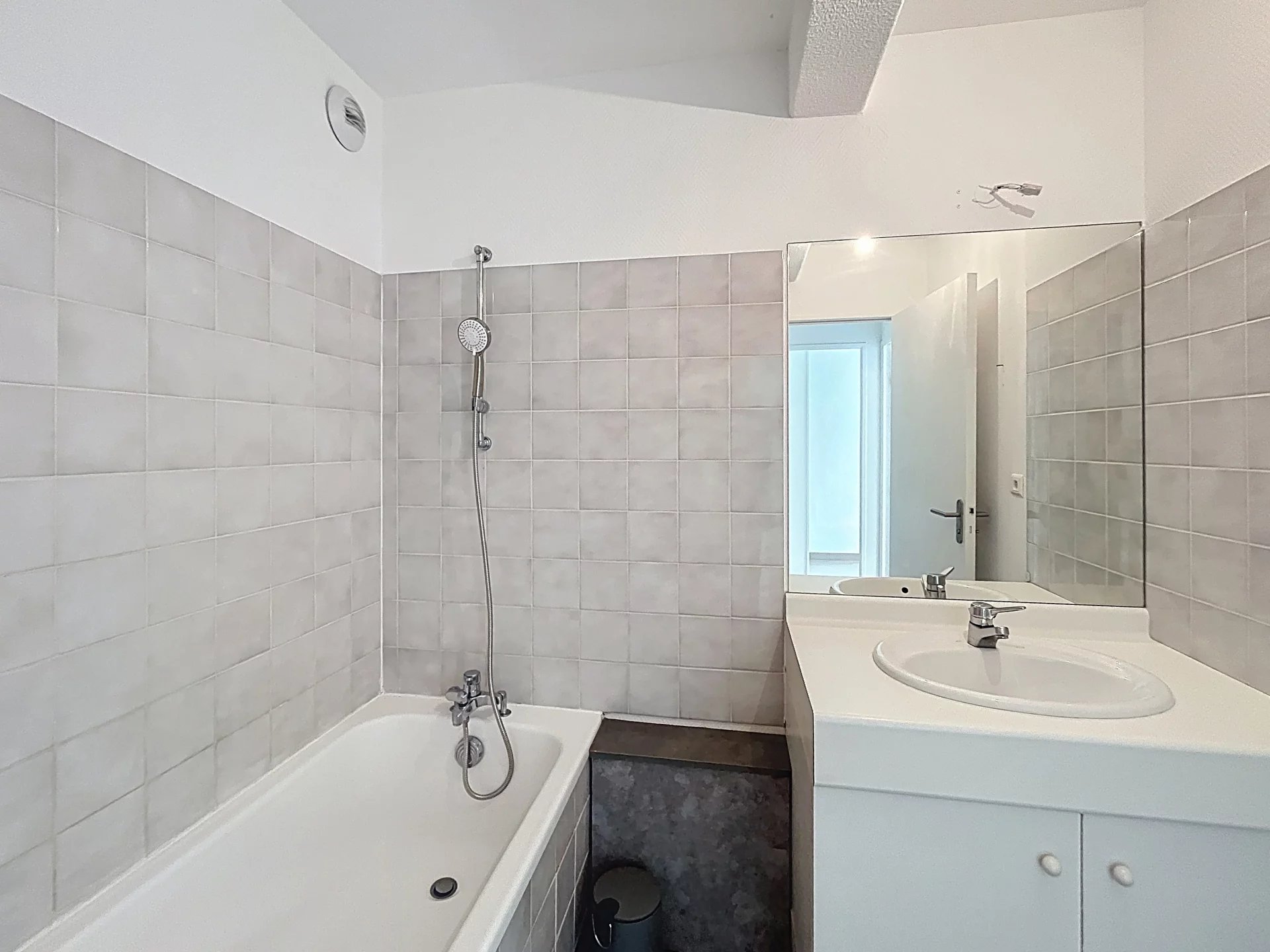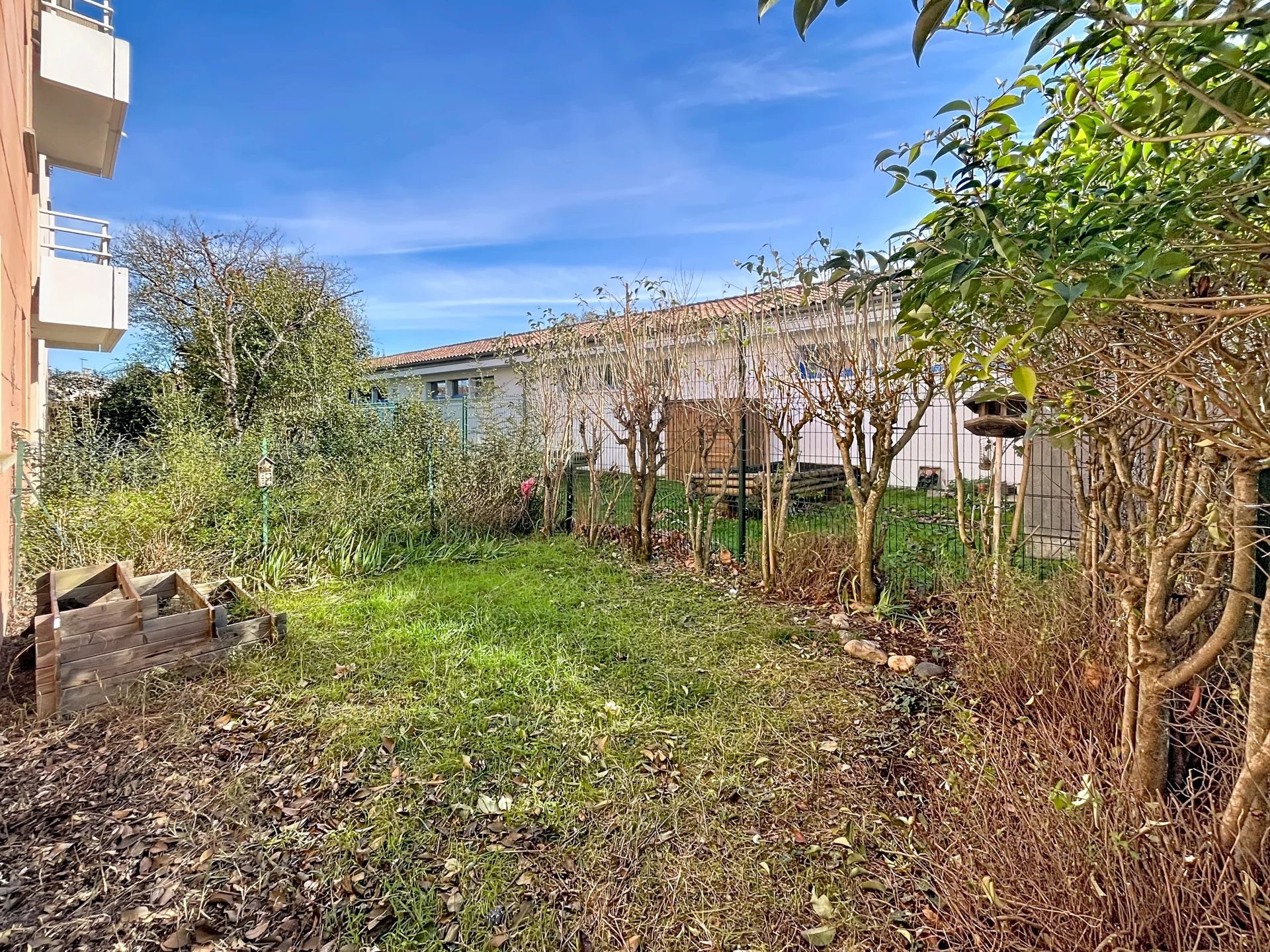 Il se compose d’une entrée, d’une cuisine séparée et partiellement équipée (plaque, hotte, four), ainsi que d’un séjour lumineux ouvrant sur une terrasse donnant accès à un jardin privatif agréable de 26 m².