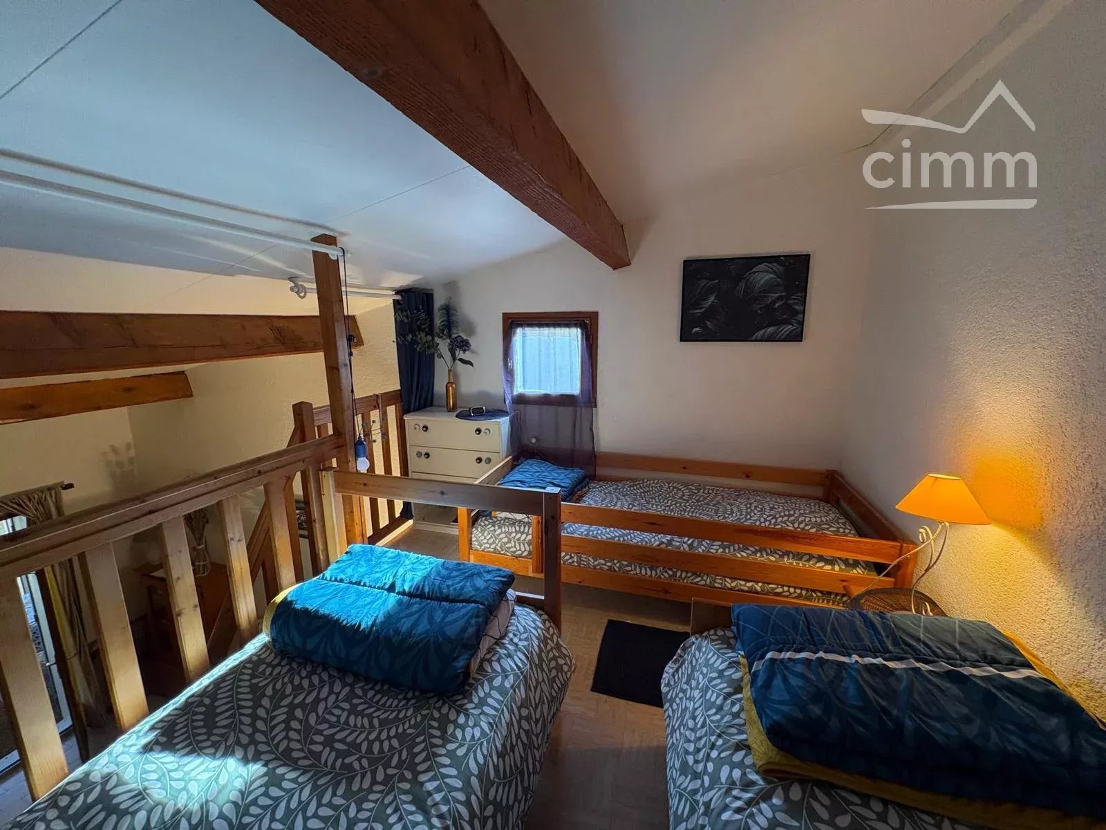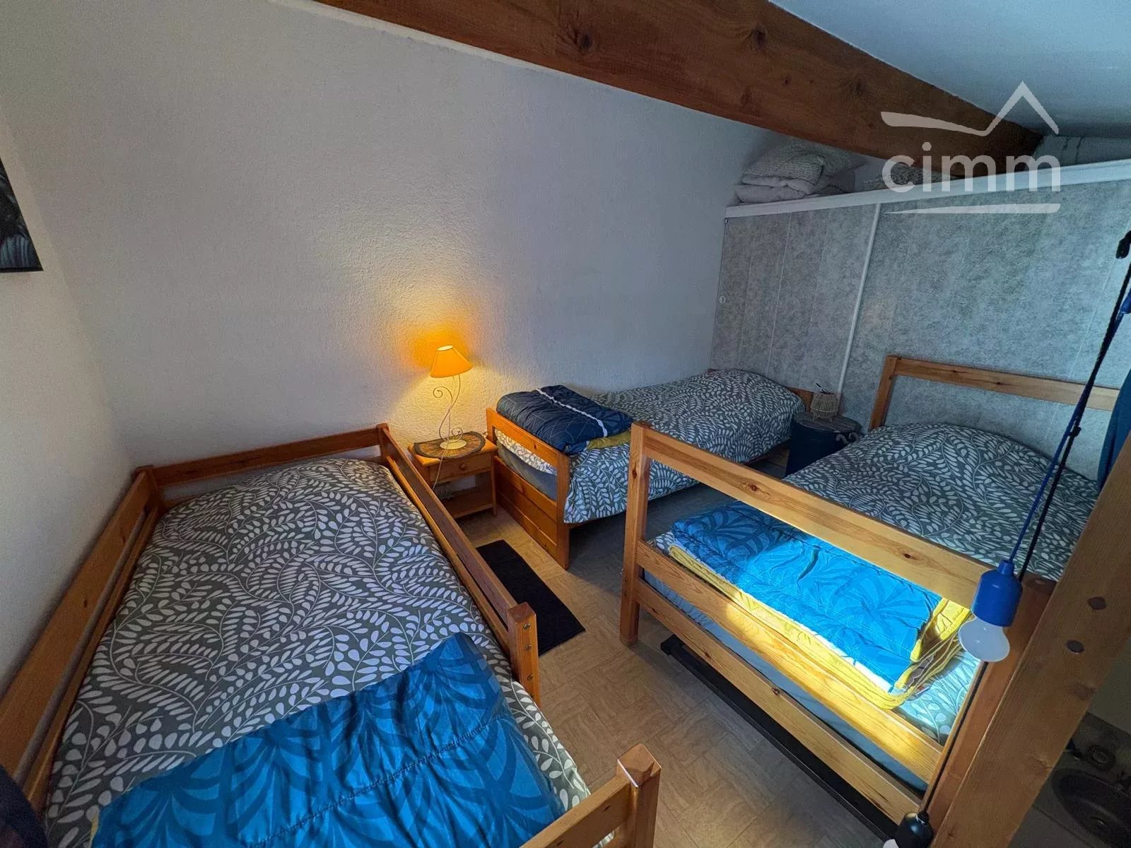 Le logement comprend un vaste séjour avec cuisine équipée, une chambre au rez-de-chaussée avec un lit en 140, une mezzanine à l’étage avec trois lits simples, une salle de bain et des WC séparés.