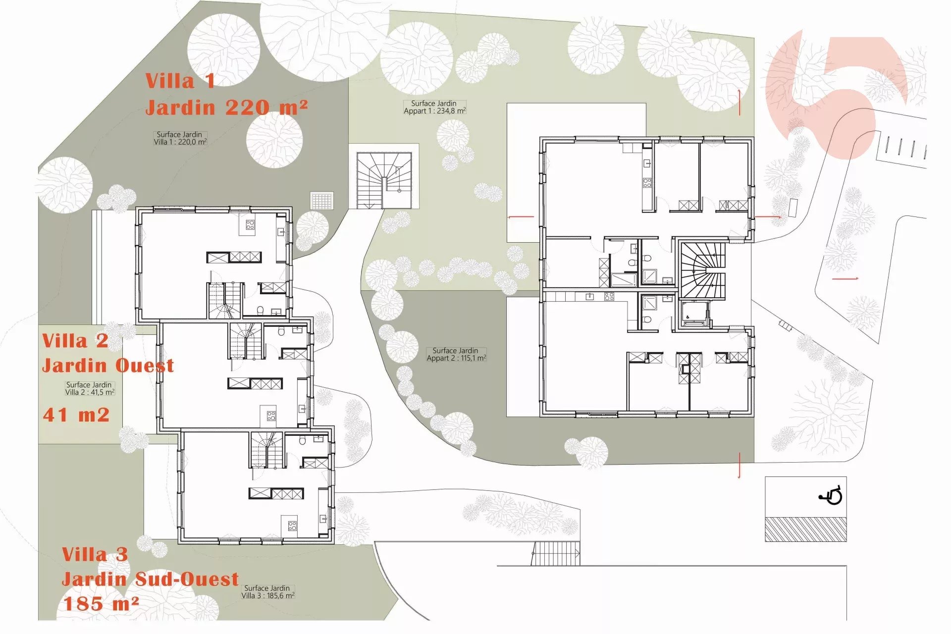 Jardin Sud et Ouest : 185 m²