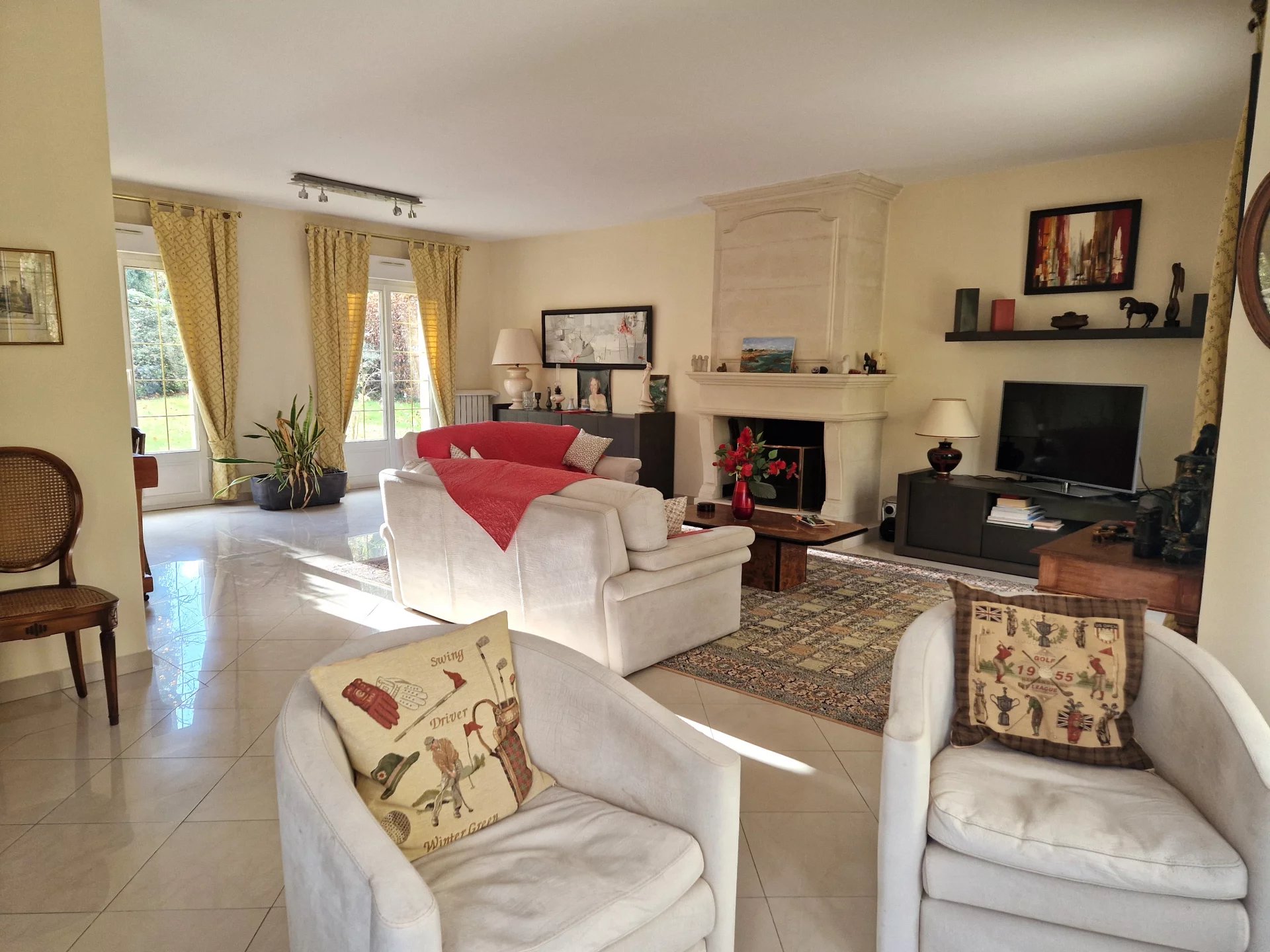 Vous découvrirez au rez-de-chaussée: grande entrée avec placard, cuisine dinatoire aménagée/équipée avec cellier attenant, séjour/salle à manger de 57 m² lumineux et traversant avec cheminée, une chambre avec salle de bains attenante.