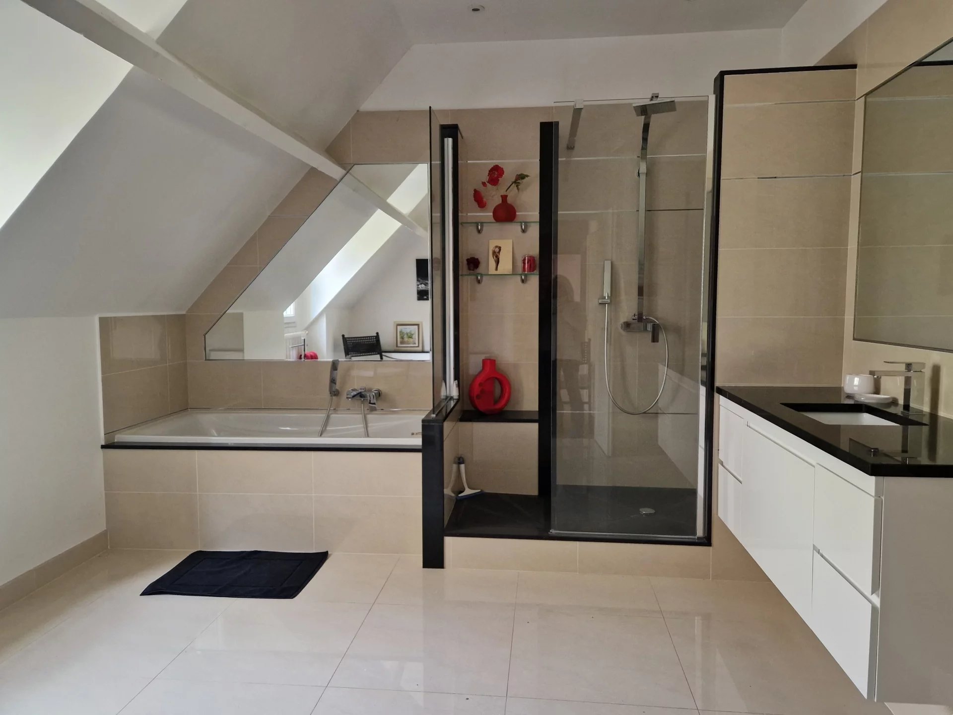 A l'étage, une mezzanine dessert 3 chambres spacieuses dont un magnifique espace parentale avec dressing et grande salle de bains aménagée, une salle d'eau indépendante.