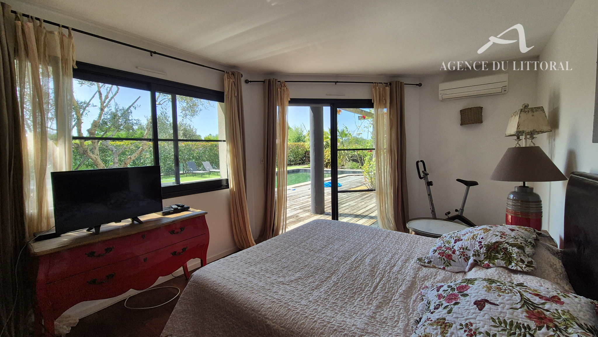 L'Agence du littoral vous propose cette superbe villa située au calme dans un environnement arboré. Elle se compose au RDC d'une pièce à vivre lumineuse de 90 m2 donnant sur une terrasse bois avec sa piscine, un vestiaire invités, une cuisine équipée/aménagée, un cellier/buanderie, une salle d'eau, un wc indépendant, trois chambres dont une suite parentale composée d'un dressing traversant, une salle de bains avec wc. A l'étage un espace bureau en mezzanine, une suite composée d'une salle d'eau et wc. Pour compléter ce bien un garage attenant de 45 m2.